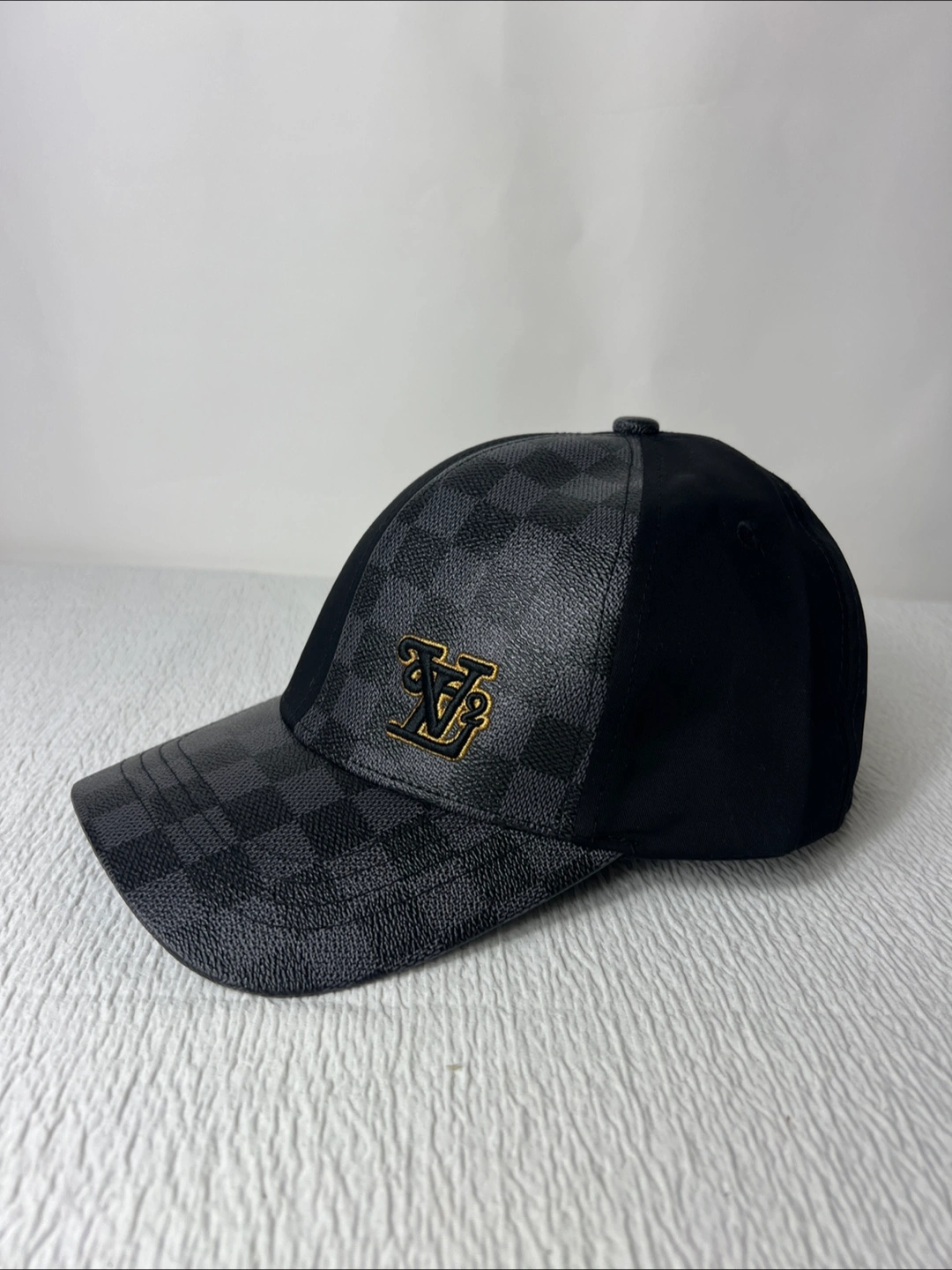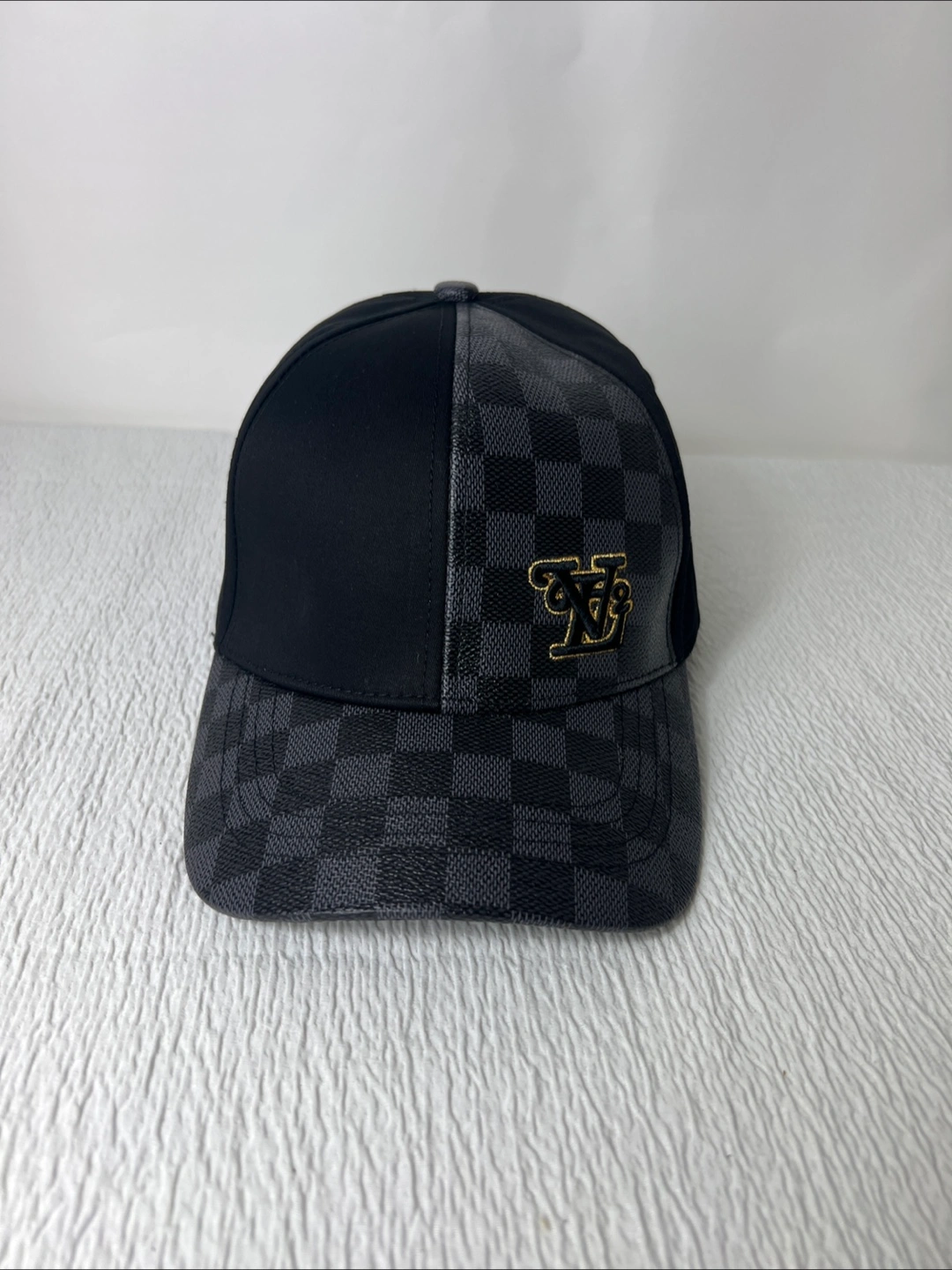 Black and grey checkered baseball cap. Features a Louis Vuitton logo. Adjustable strap.