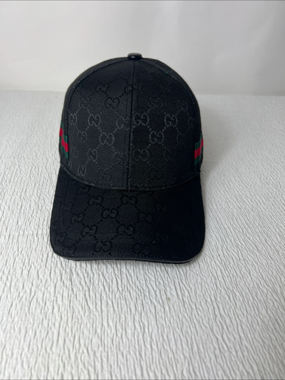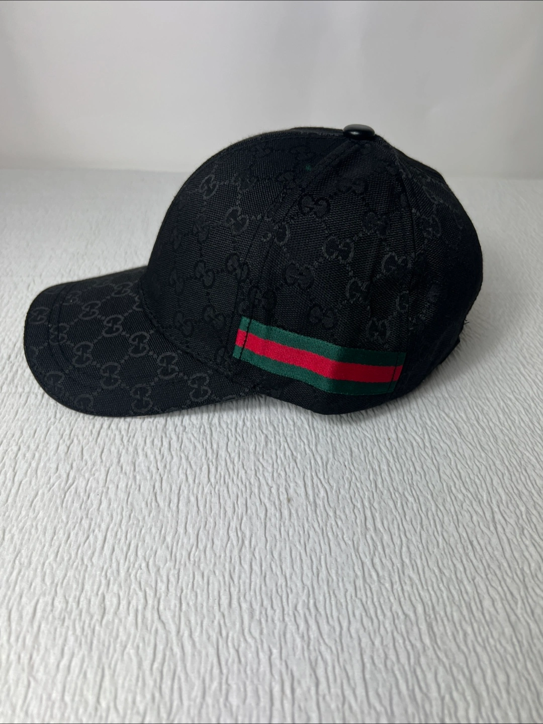 Black baseball cap. GG logo print. Red and green web stripe detail. Adjustable.