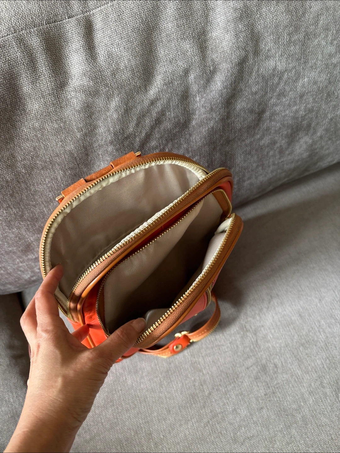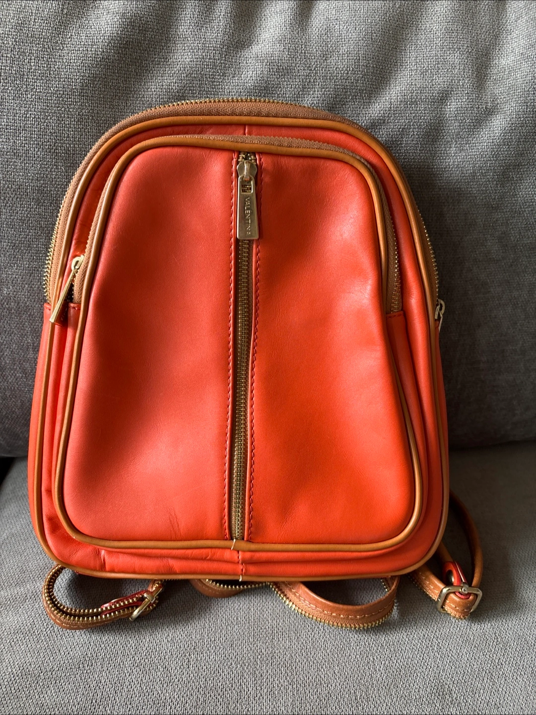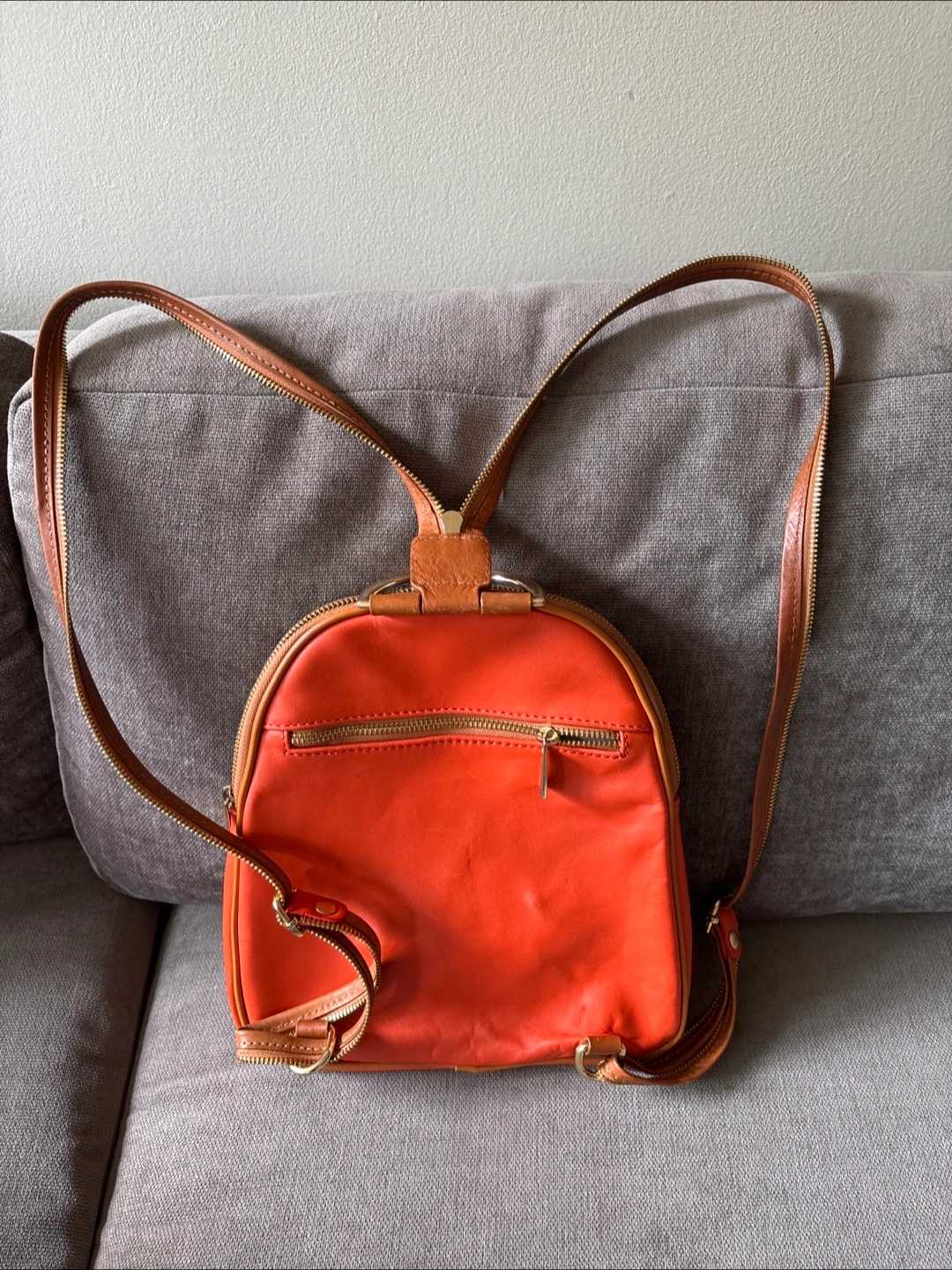 347Small orange leather backpack. Features gold zippers and tan leather trim. Adjustable straps. Two main compartments and 1 auxiliary compartment Very useful for daily use