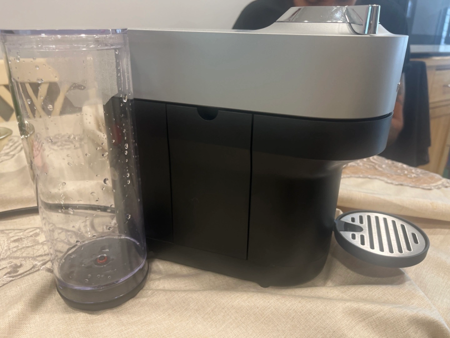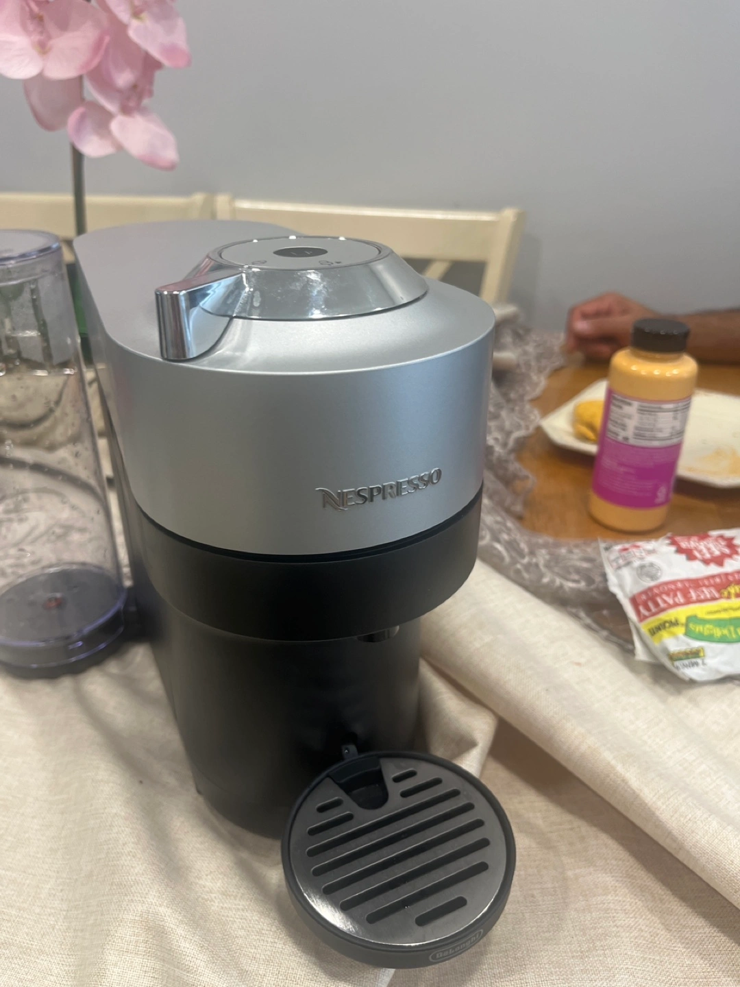 Compact espresso machine. Silver and black. One package of pads, one package of these skiing.