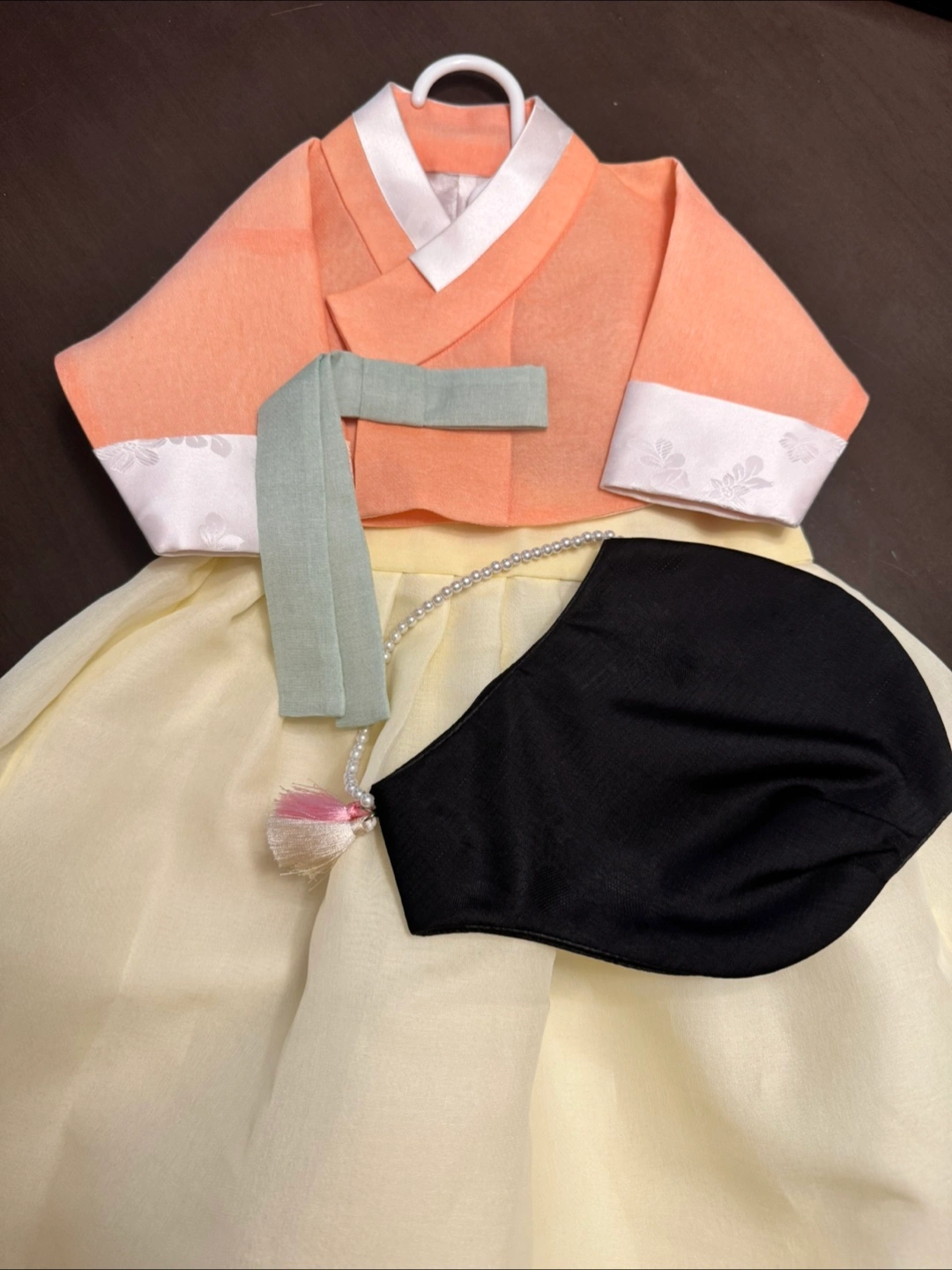 Peach Hanbok with pale yellow skirt. Includes matching accessories. Perfect for special occasions. 100days hanbok