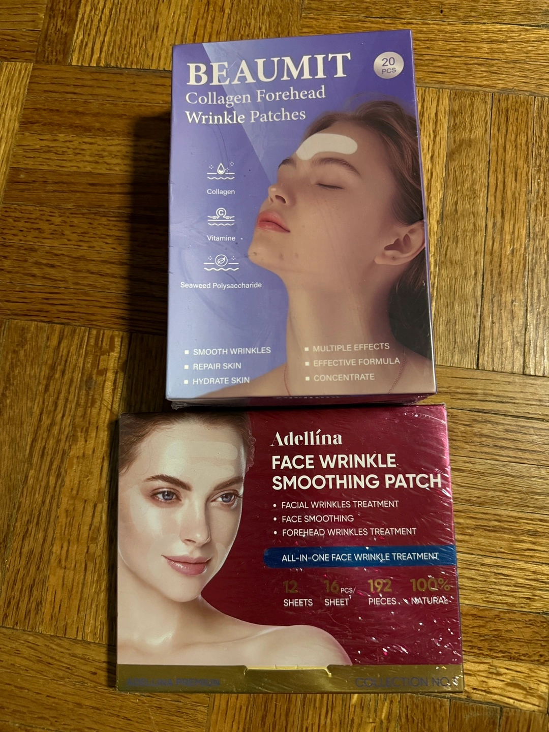 Two boxes of wrinkle patches. Beaumit patches contain collagen, vitamins, and seaweed polysaccharide. Smooth wrinkles, repair and hydrate skin. Adelina patches offer facial wrinkle treatment and forehead wrinkle treatment. All-in-one face wrinkle treatment.(brand new in box)