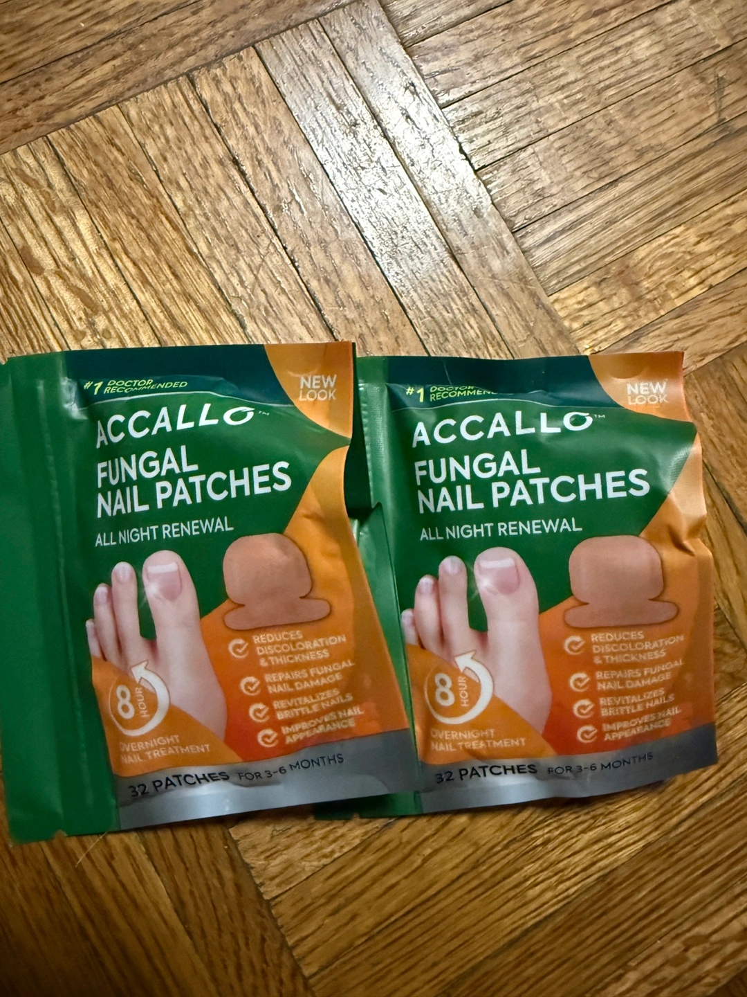 Two unopened packs of Accallo Fungal Nail Patches. 32 patches per pack. Overnight treatment. For 3-6 months. Reduces discoloration and thickness, repairs fungal nail damage, revitalizes brittle nails, improves nail appearance.
