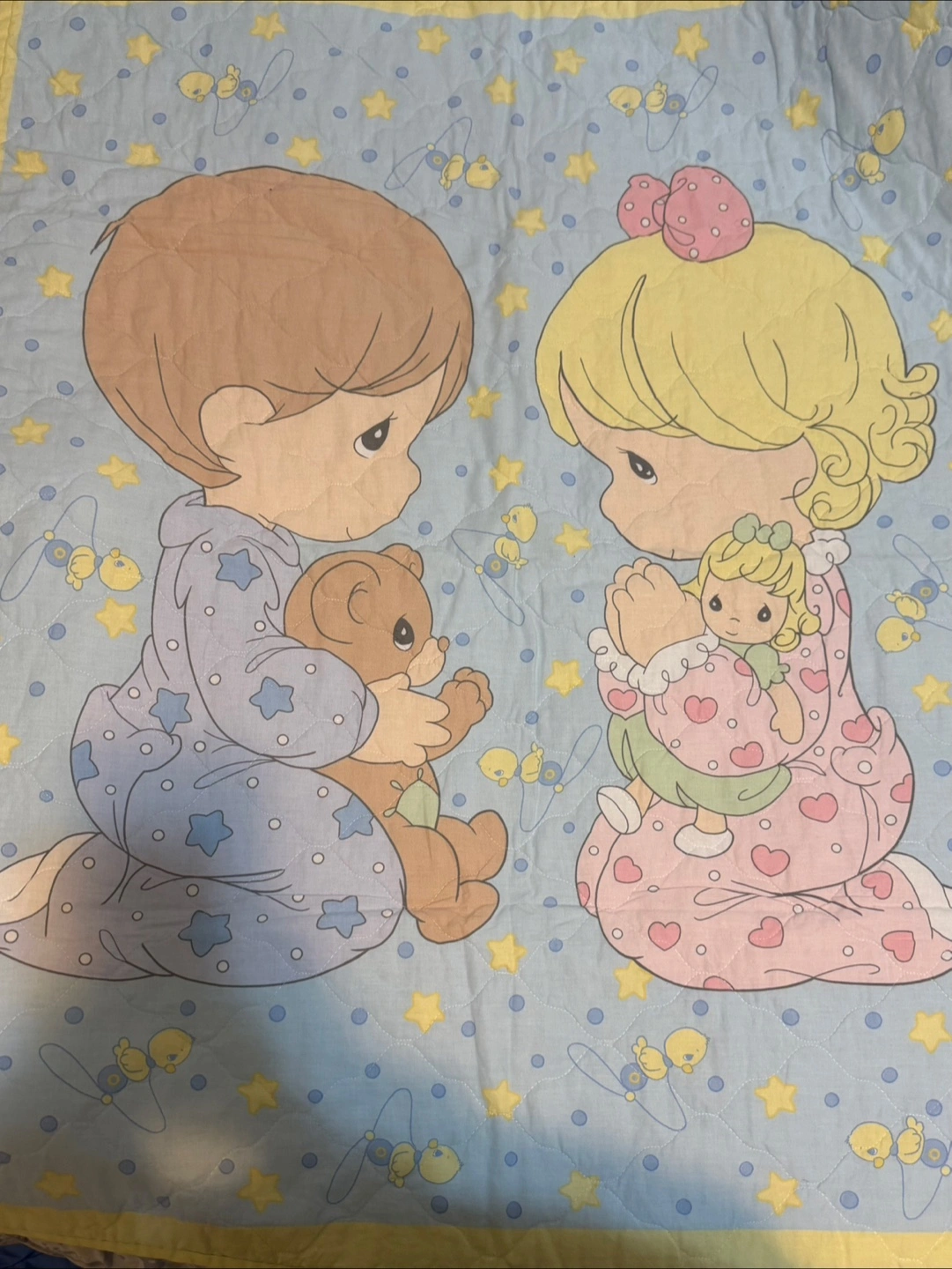 352Adorable baby quilt featuring Precious Moments characters. Light blue background with stars and birds. Perfect for a nursery or as a gift. In very good condition