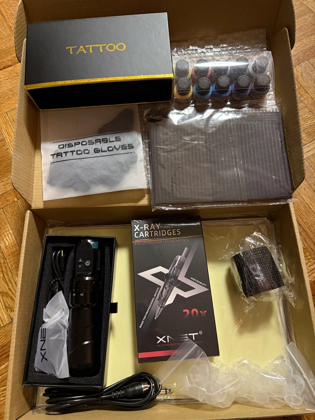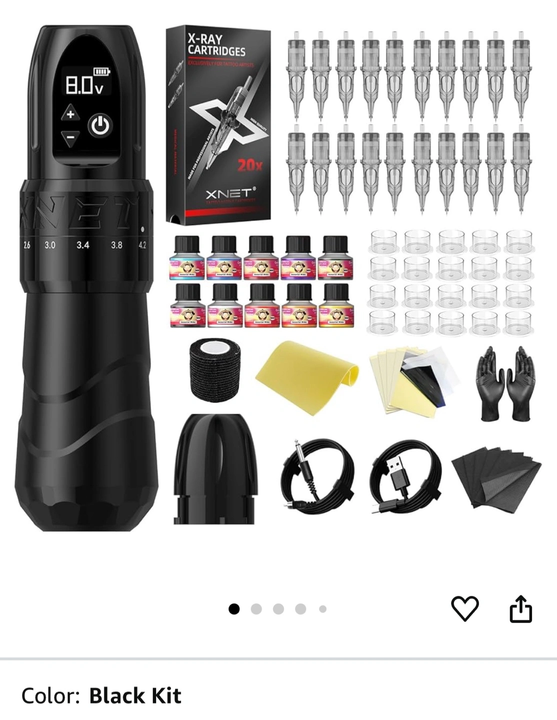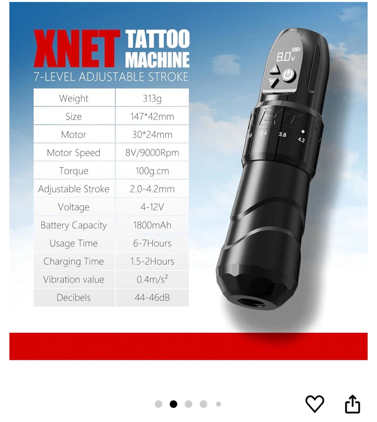 Tattoo Gun Kit Complete Tattoo Machine Kit, Xnet Cordless Tattoo Pen 7 Adjustable Strokes with 1,800 mAh Battery, 20pcs X-ray Mixed Sizes Cartridge Needles Set Supply for Starter(brand new in box)