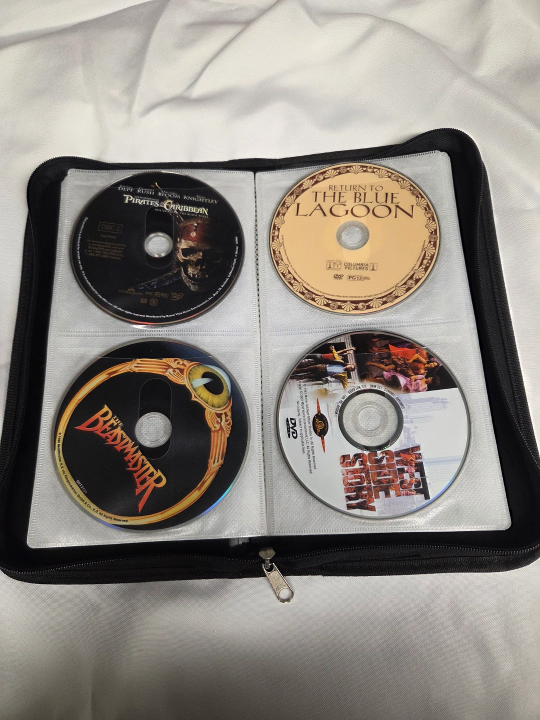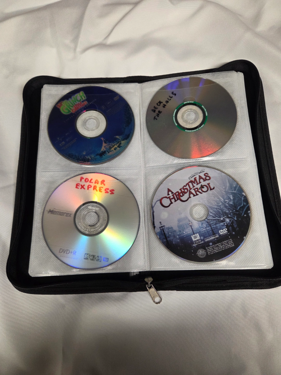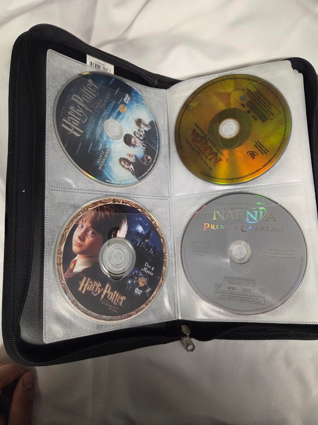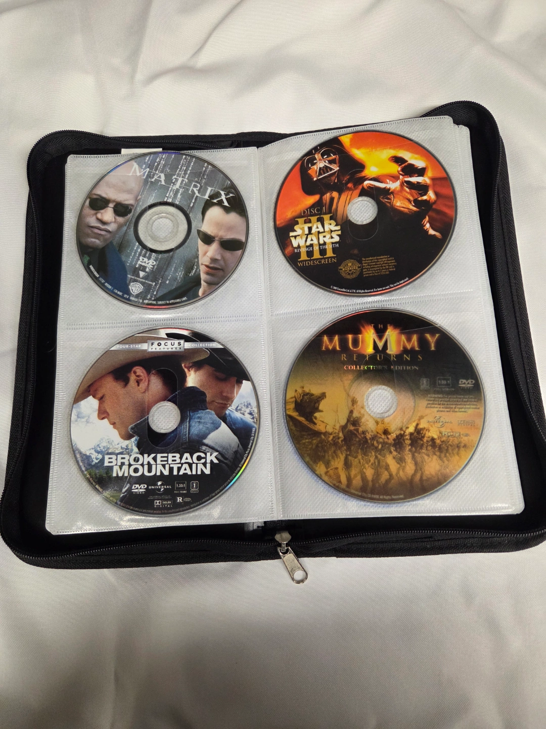 Large collection of DVD movies. Titles include The Matrix, Star Wars Episode III, The Mummy Returns, Brokeback Mountain, The Grinch, Back to the Walls, Polar Express, A Christmas Carol, My Big Fat Greek Wedding, Jurassic World, Pearl Harbor, Harry Potter and the Goblet of Fire, Harry Potter and the Sorcerer's Stone, Narnia: Prince Caspian, Narnia: The Lion, the Witch, and the Wardrobe, Spider-Man 2, The Hobbit, The Lord of the Rings. All in a zippered carrying case.