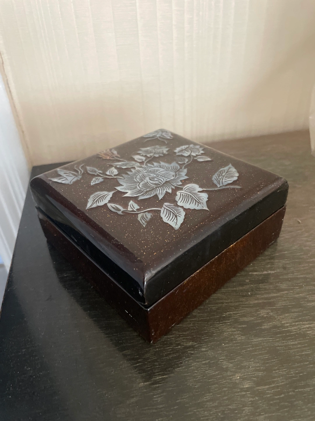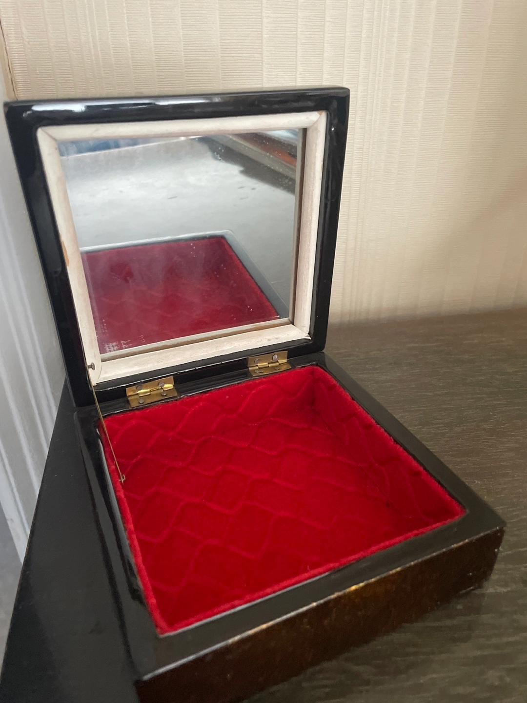 60Small square wooden box. Black lacquer finish. Floral design on top. Red velvet interior. Small mirror inside the lid. Perfect for trinkets or jewelry.