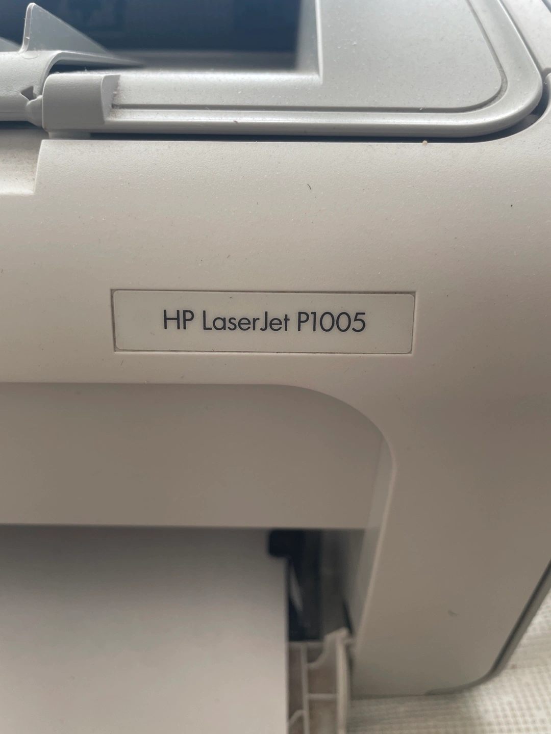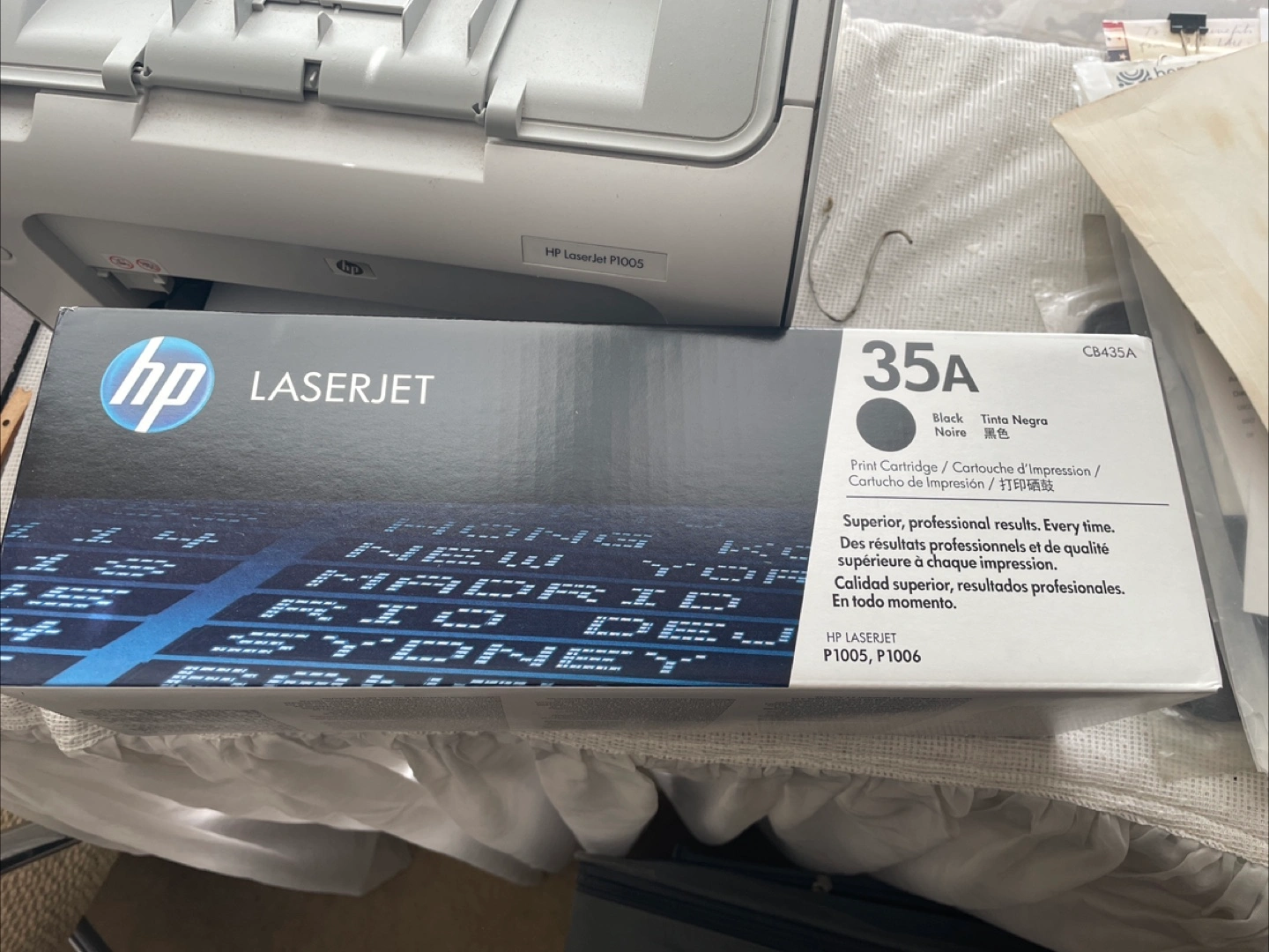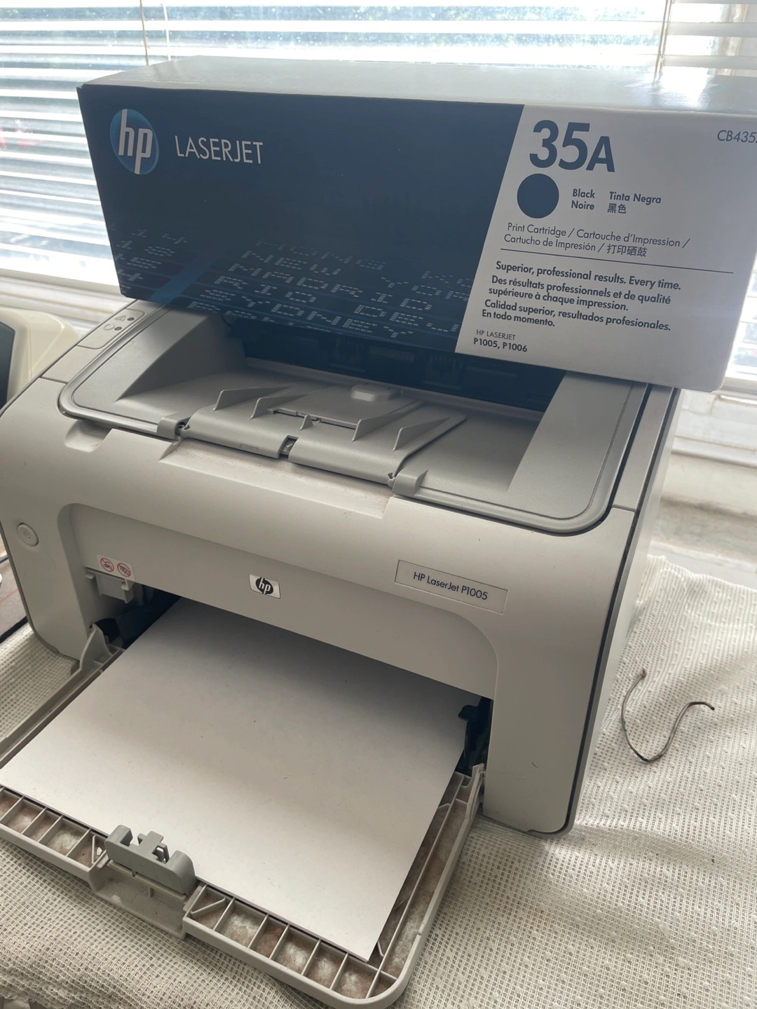 60HP LaserJet P1005 printer. Includes an unopened black toner cartridge (35A). Minor cosmetic wear.
