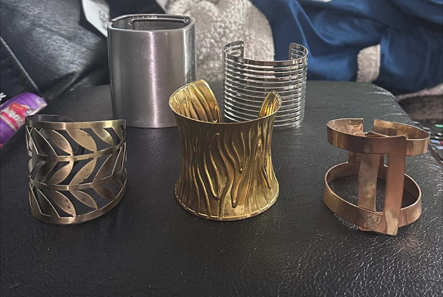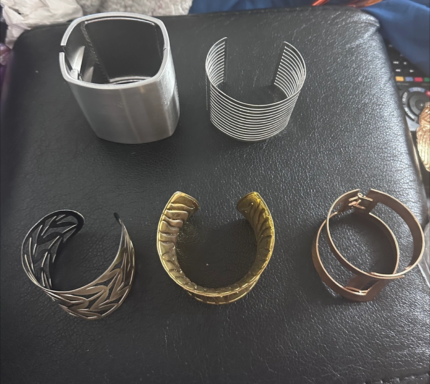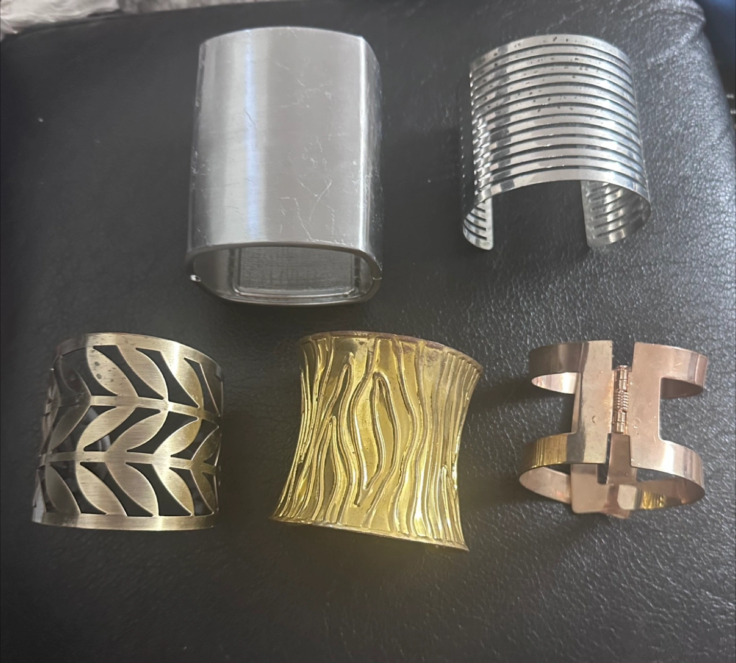 Set of five different metal cuff bracelets. Variety of colors and styles. Great for layering or wearing individually. Metal and other materials.