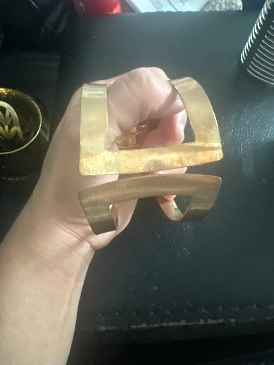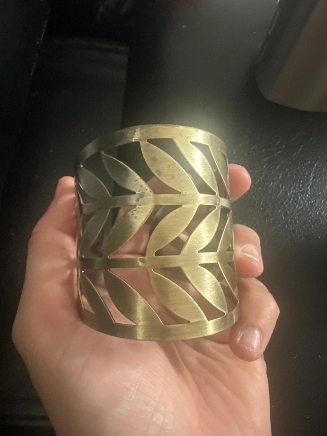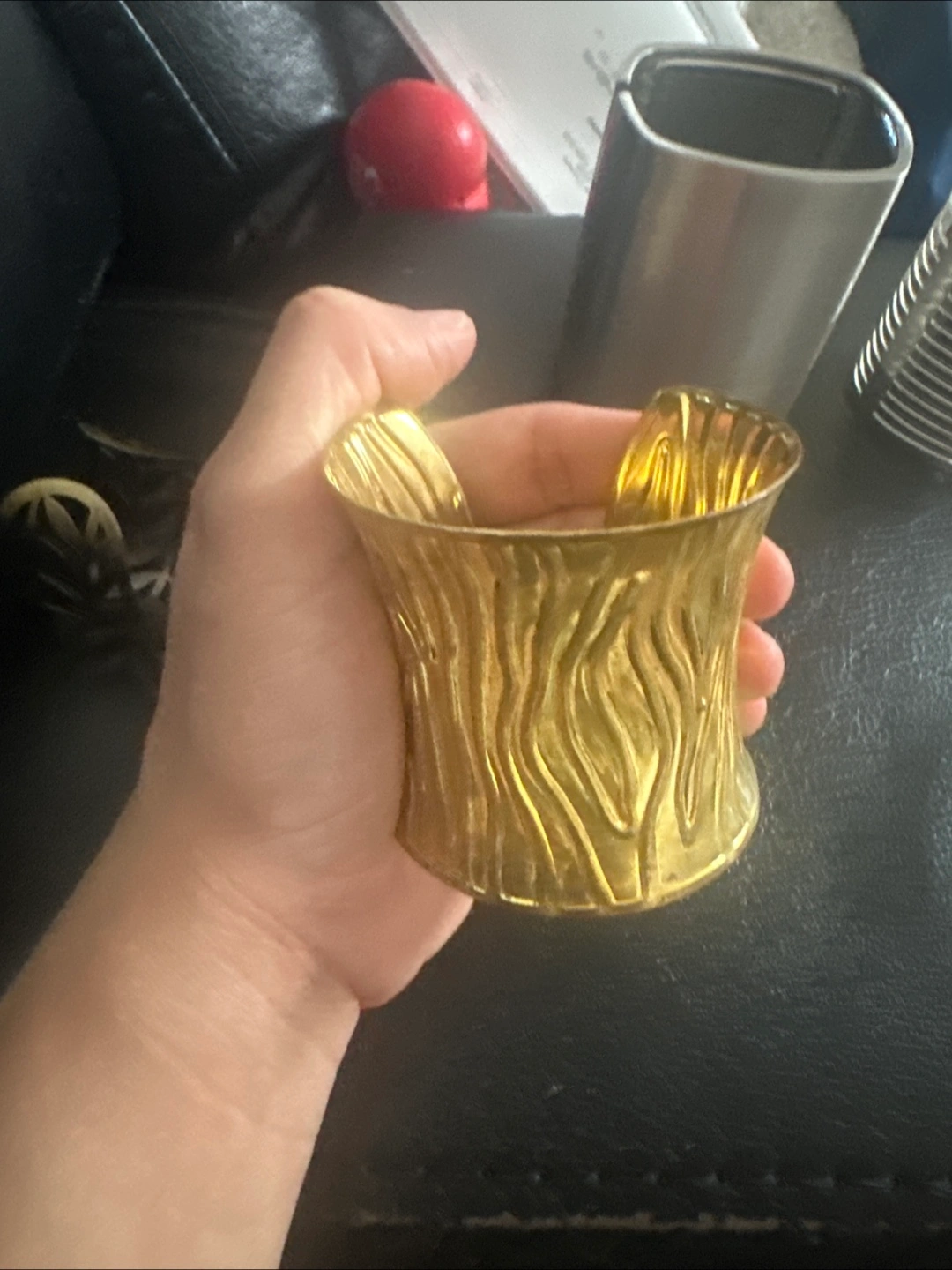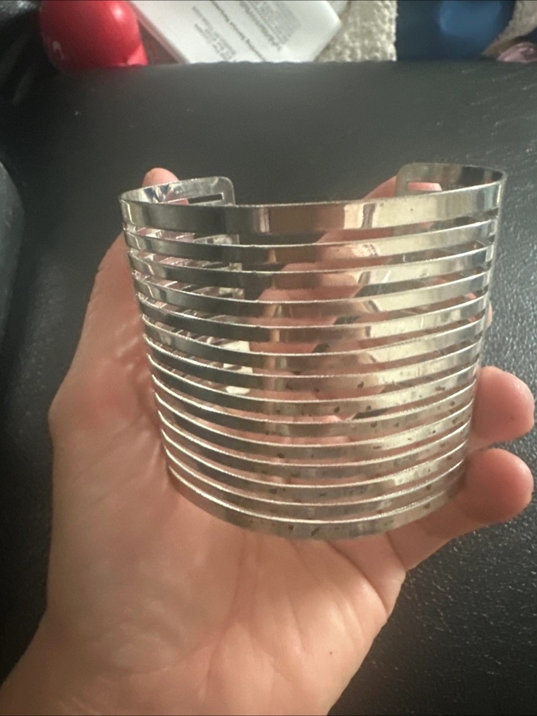 Set of five different metal cuff bracelets. Variety of colors and styles. Great for layering or wearing individually. Metal and other materials.