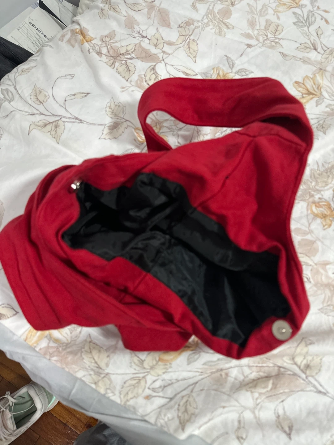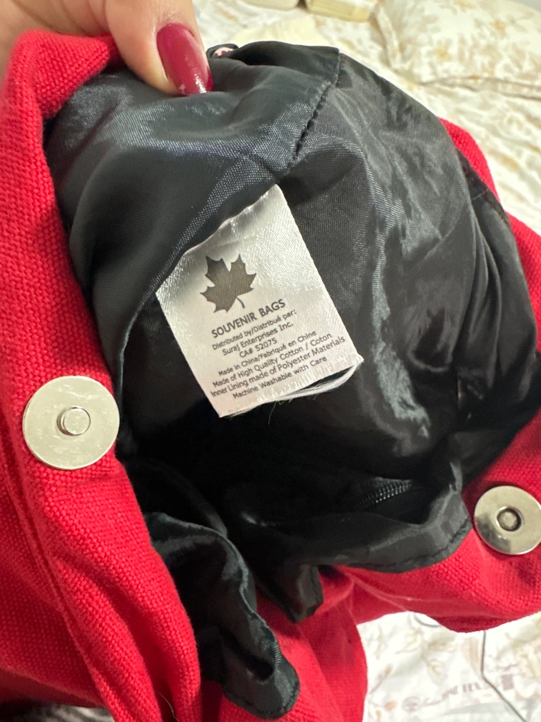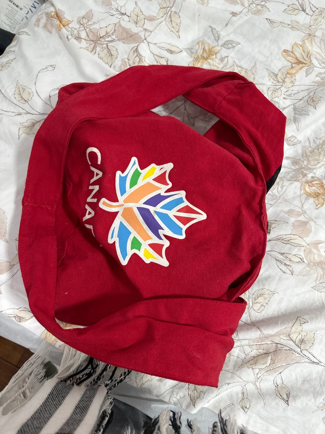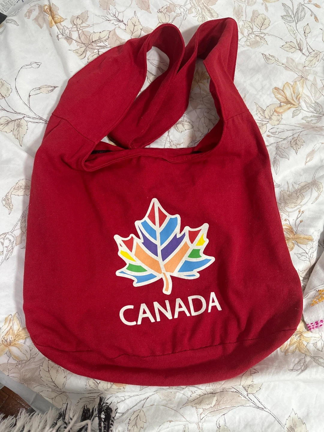 This red canvas shoulder bag features a vibrant, colorful maple leaf and "CANADA" graphic. It's lined with black fabric and has a magnetic snap closure. Made in China with a blend of cotton and polyester.