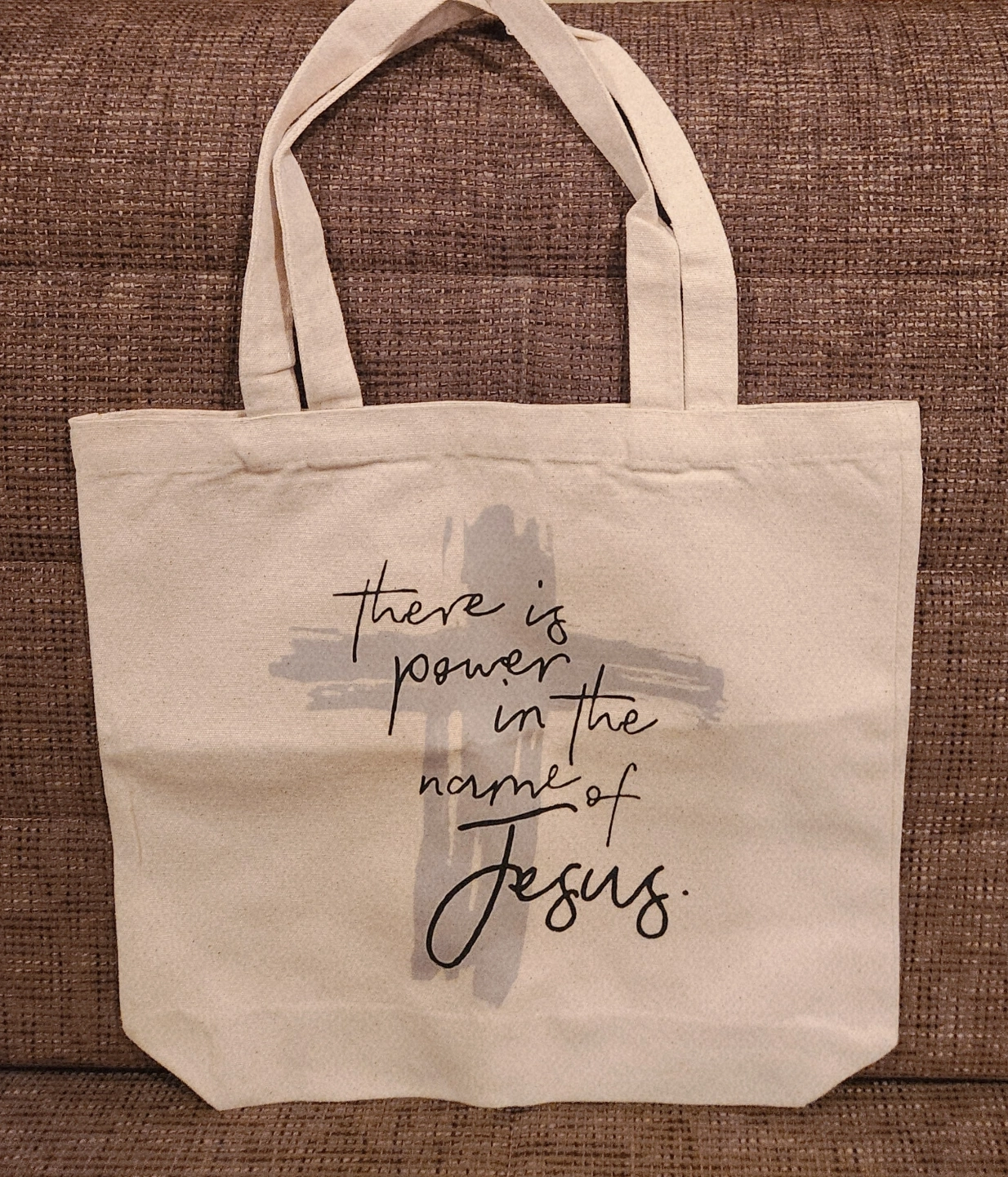 Light tan canvas tote bag. Features a cross and the text, "There is power in the name of Jesus." Great for everyday use or gifting.
