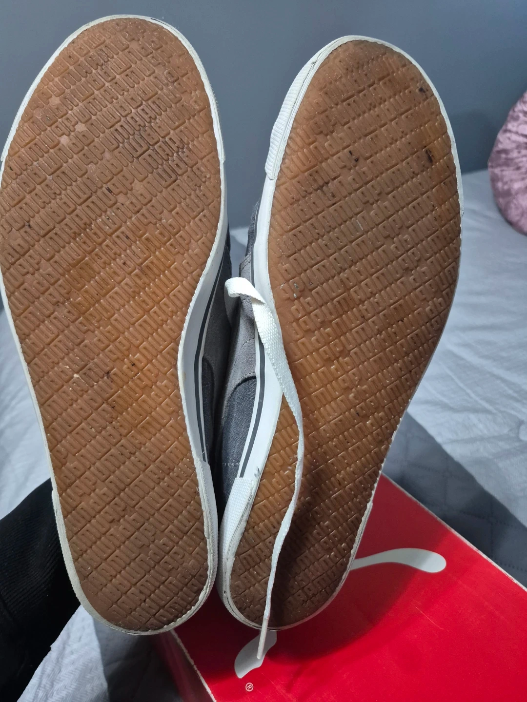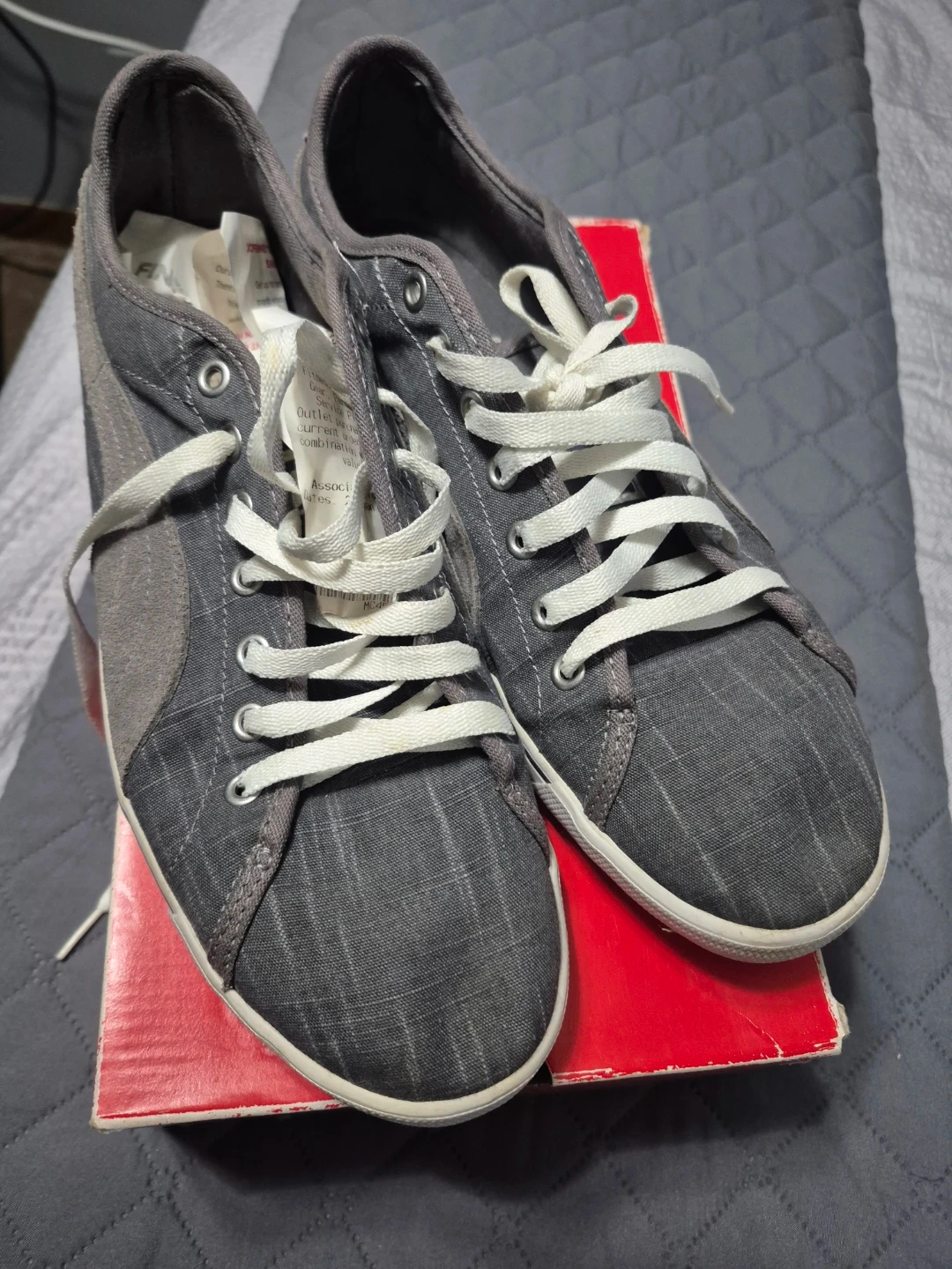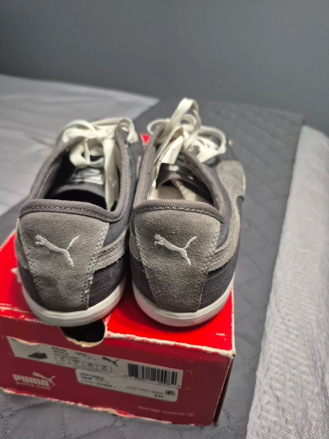 These Puma sneakers are a stylish grey with suede and canvas detailing. They feature white laces and white soles. Includes the original Puma box. Good for casual wear!