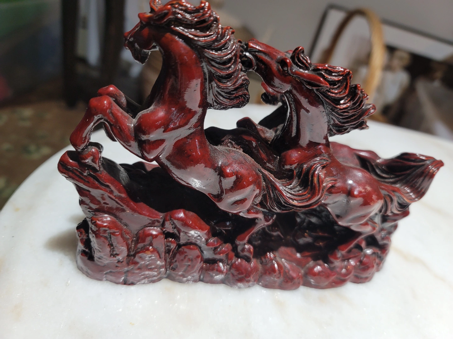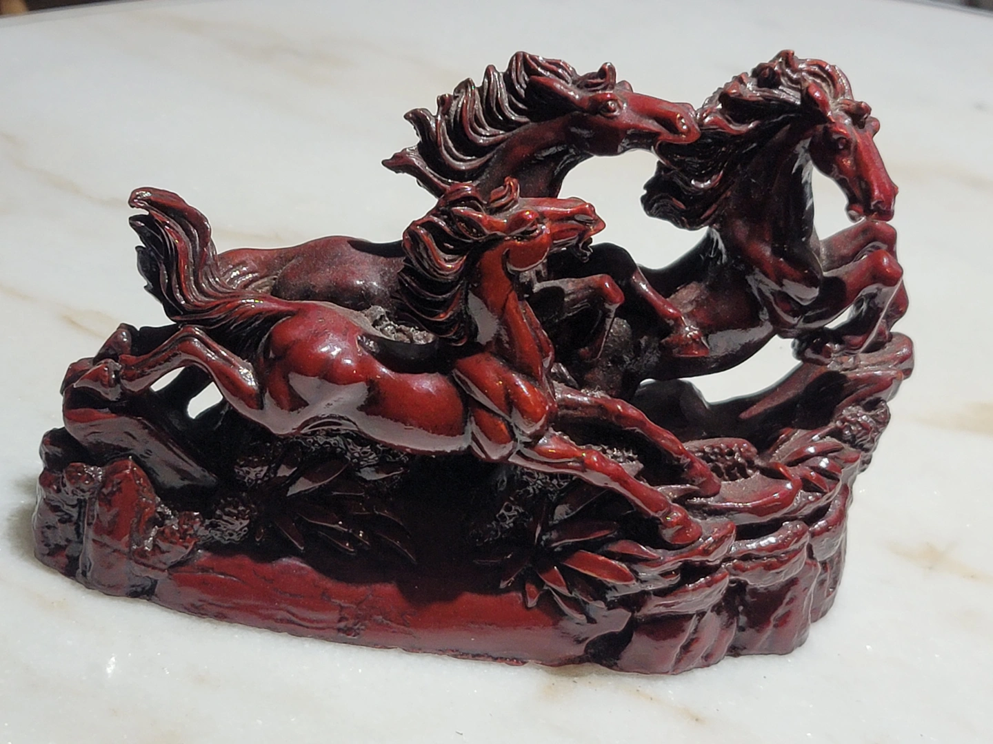 18Red resin statue. Three horses running. Detailed carving. Collectible figurine. Great for a desk or shelf. cash and pick up only