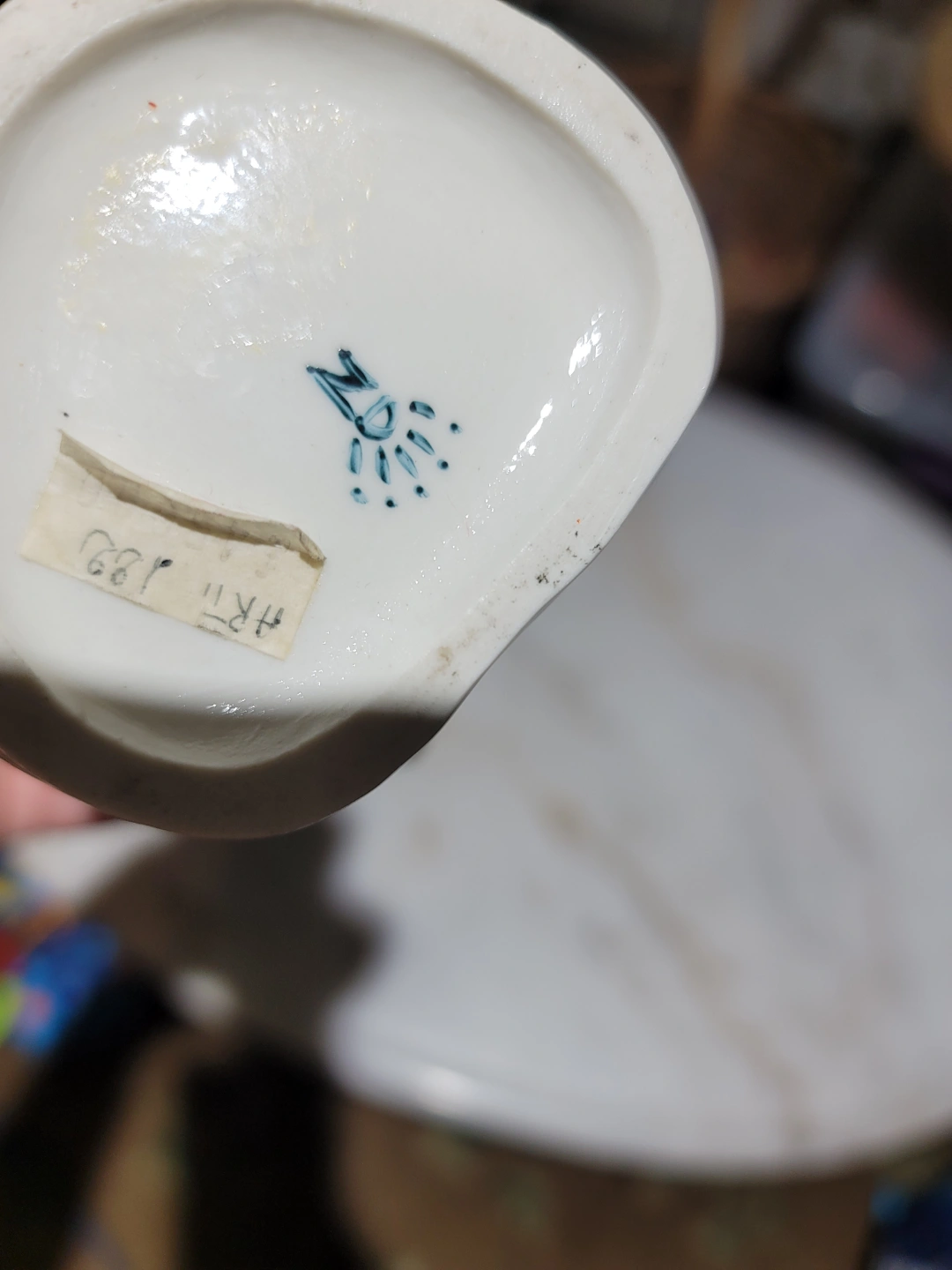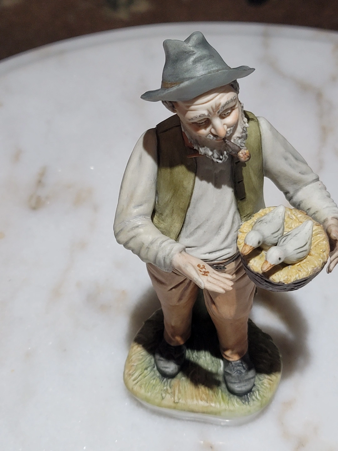 18Hand-painted porcelain figurine. Depicts an elderly man in a hat holding a basket of geese. Detailed clothing and features. Small, collectible item. cash and pick up only