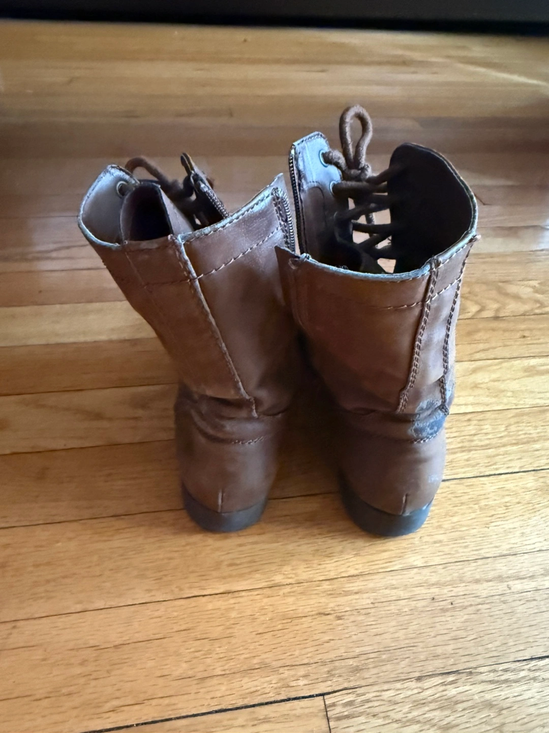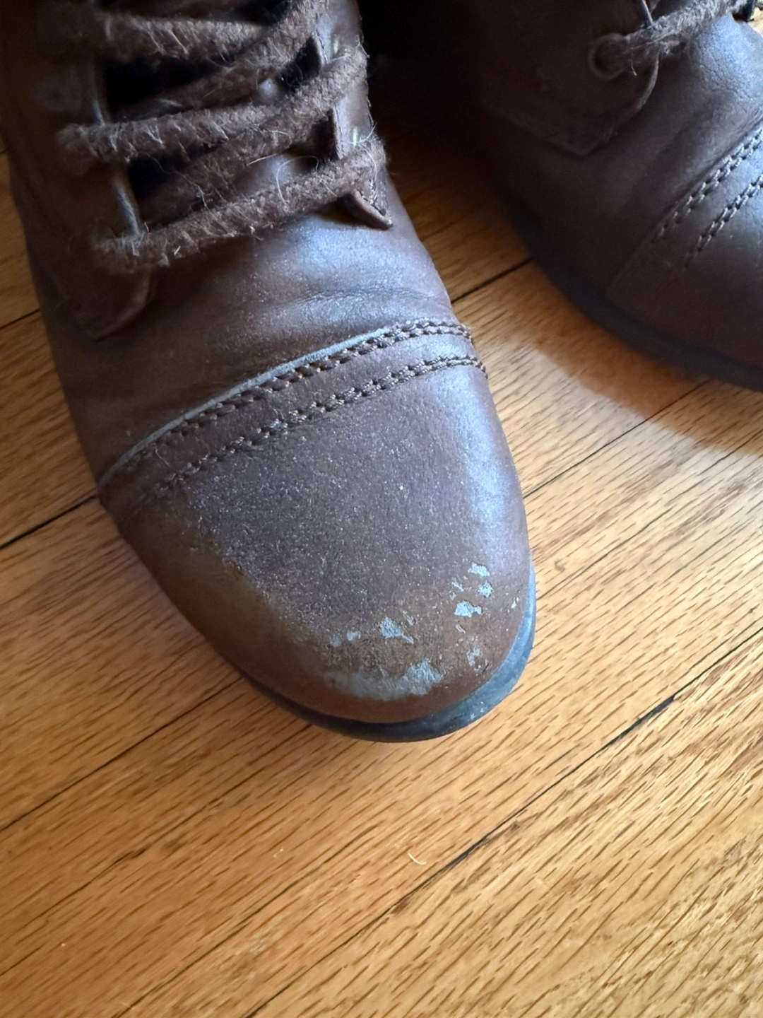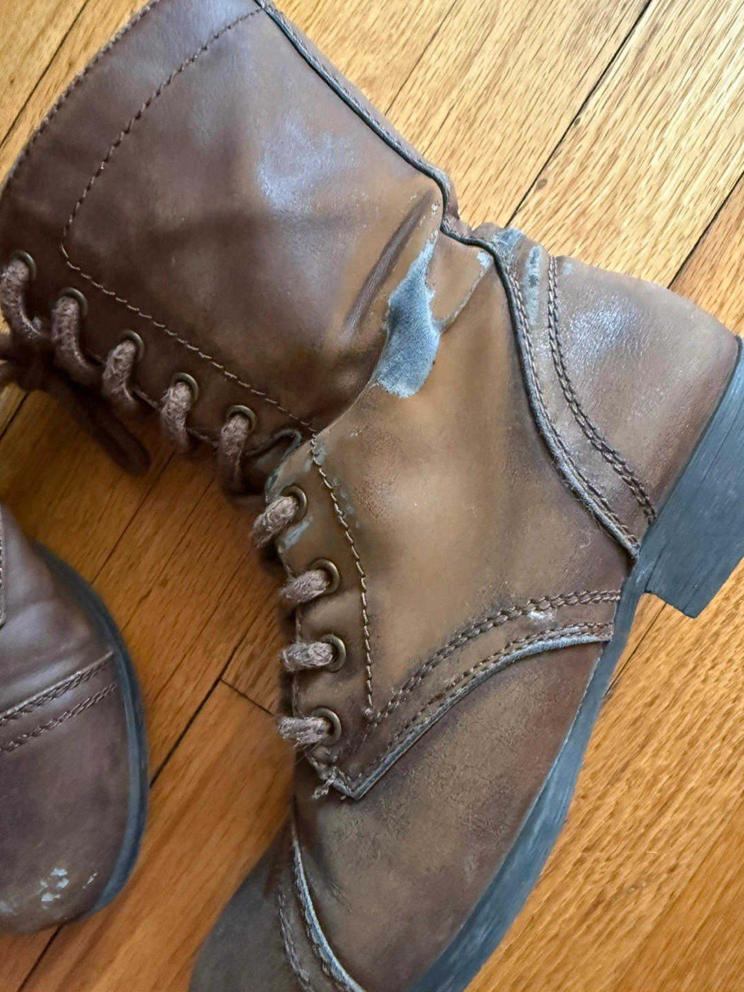 Women's brown leather lace-up boots. Size 7. Some appearance of wear and tear (distressed design). Made in China. Can deliver if you are close by.