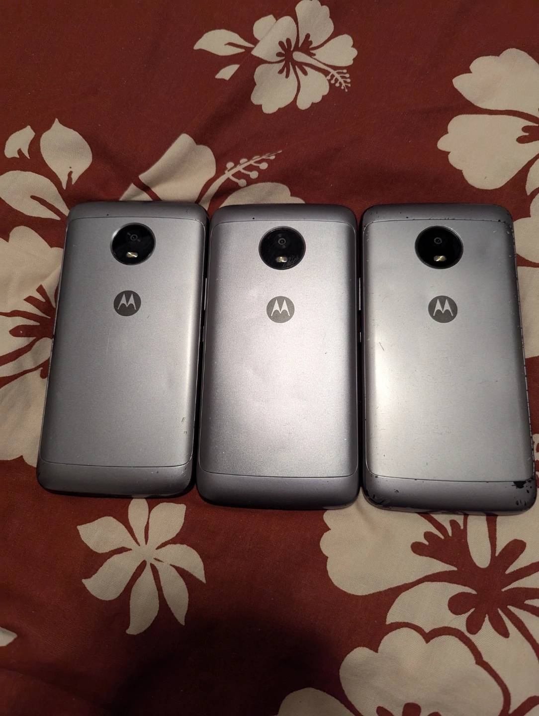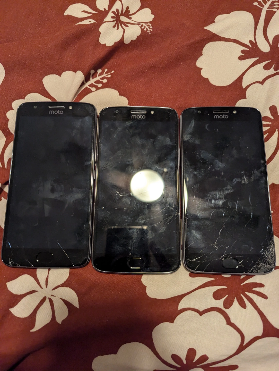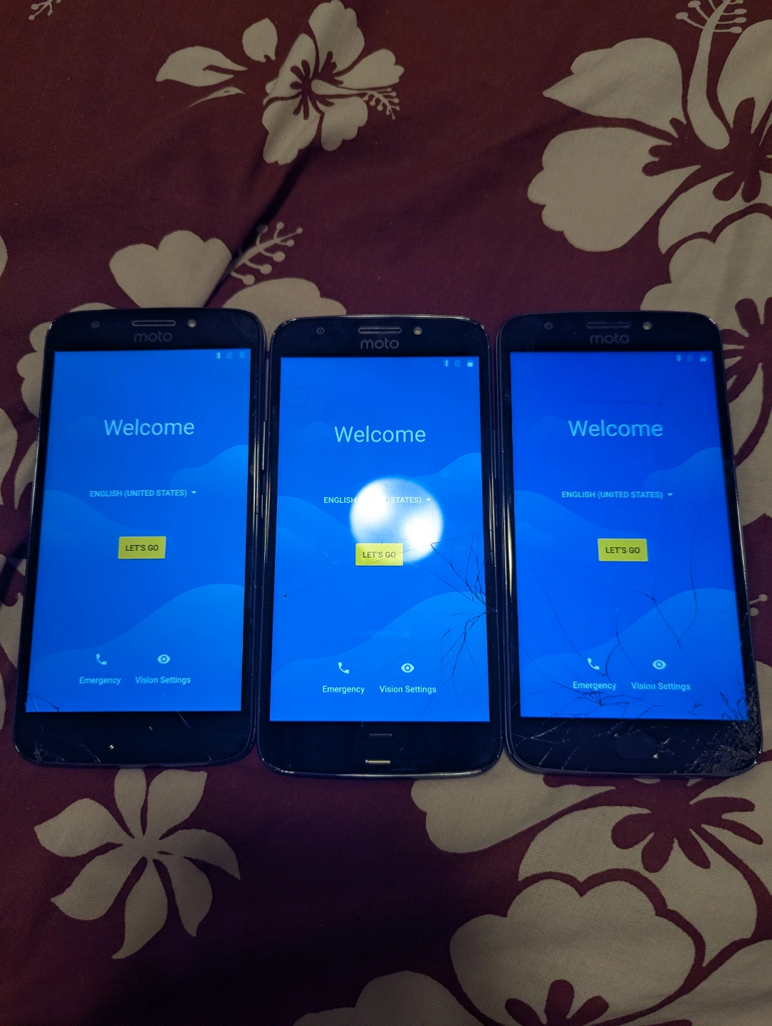 This phone lot consists of 3 Motorola Moto E4 Plus phones, all of which do work, but have cracked screens and beaten back covers. Pickup only at Avenue D/East 45th Street.