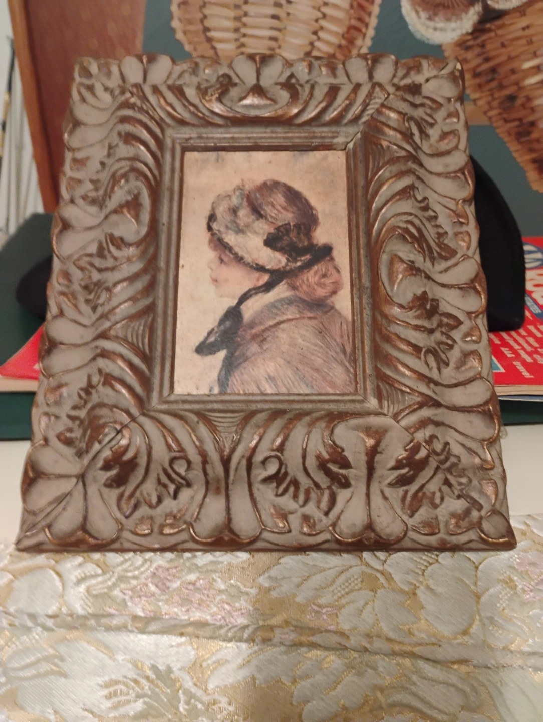 Small framed print. Features a girl in a hat. Ornate frame, possibly plaster. Antique or vintage style.