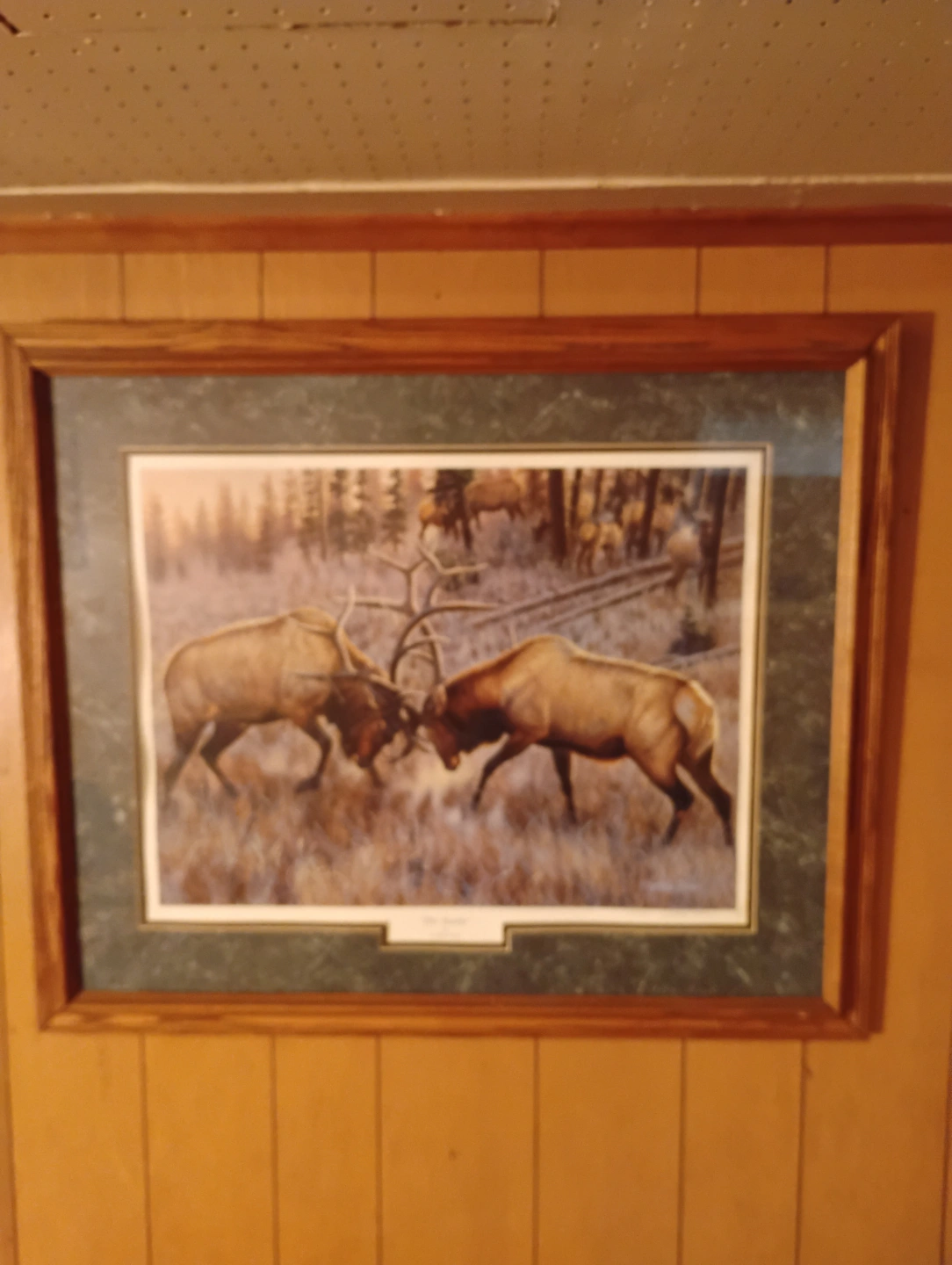 Framed wildlife art print "The Battle"featuring two elk. Beautiful artwork in a wood frame. Matted and ready to hang. Artist signature visible.Paid 260$