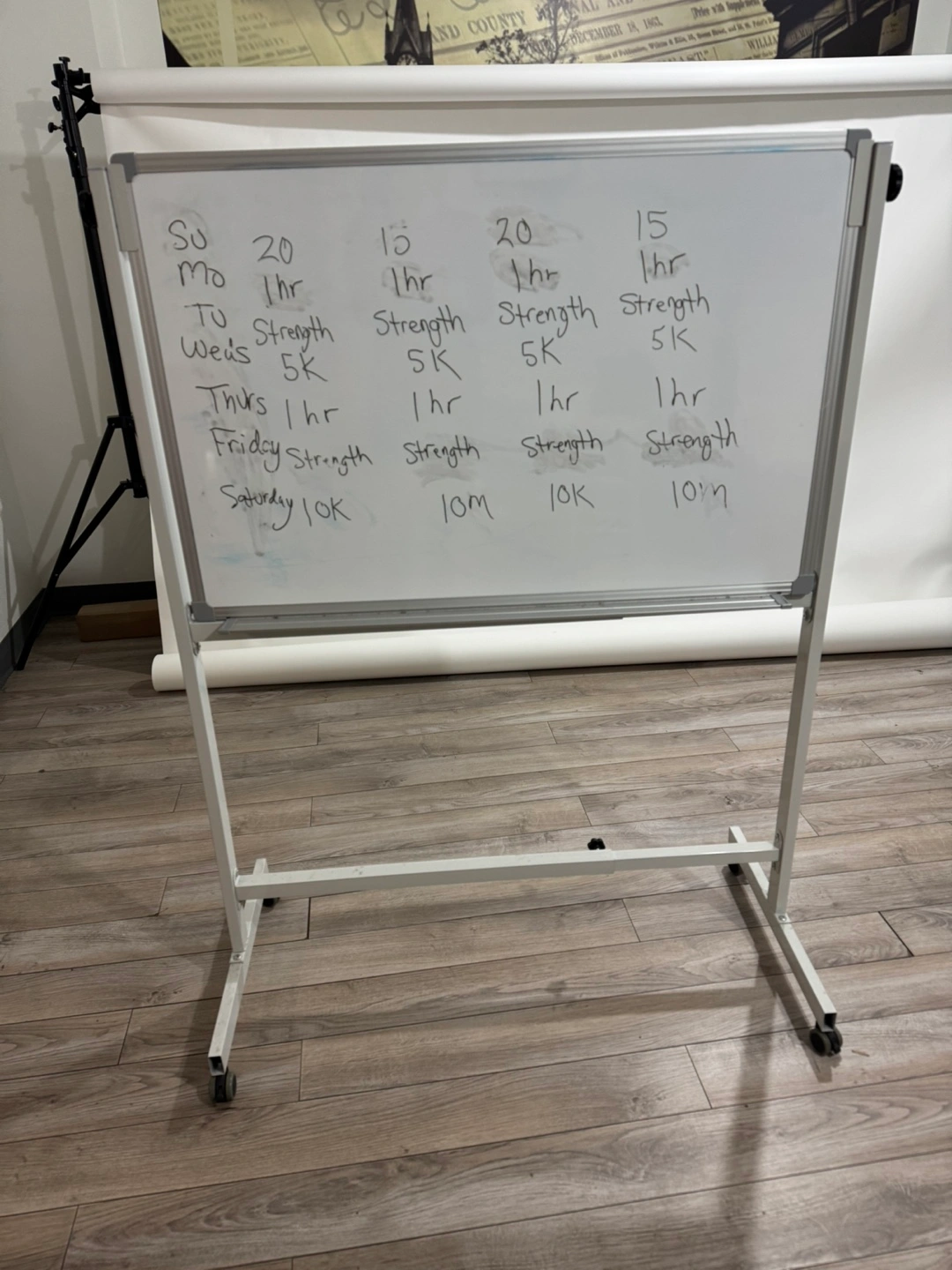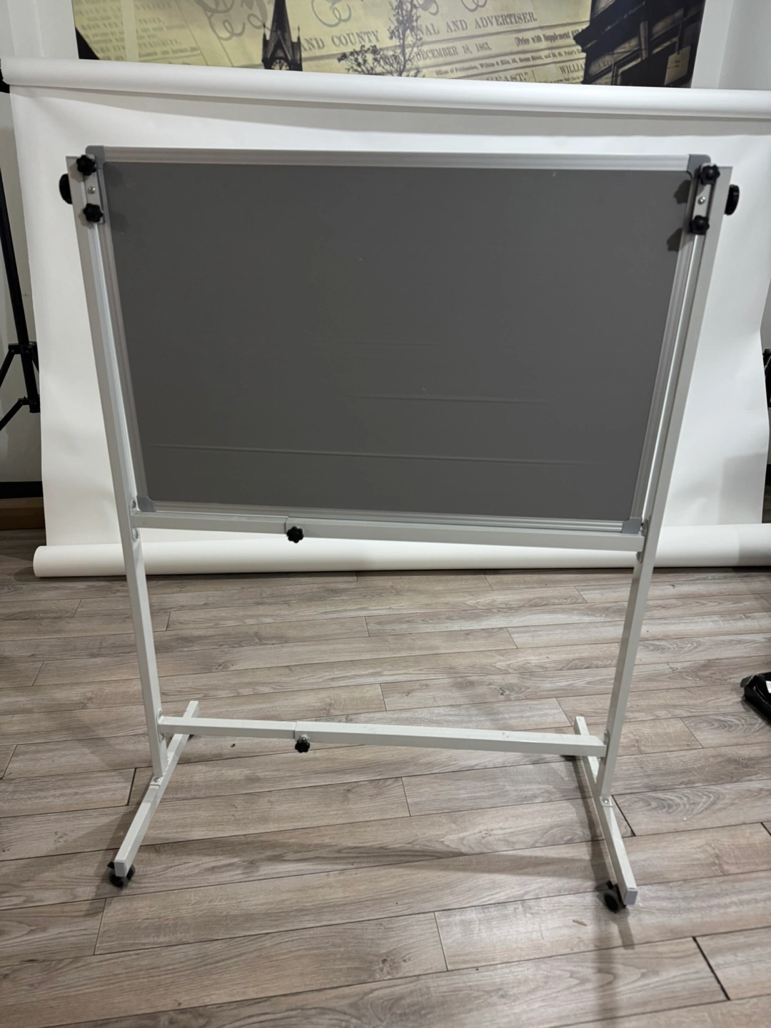 82Portable whiteboard on a stand. Features wheels for easy mobility. Gray writing surface. Aluminum frame. Great for classrooms, offices, or home use.
