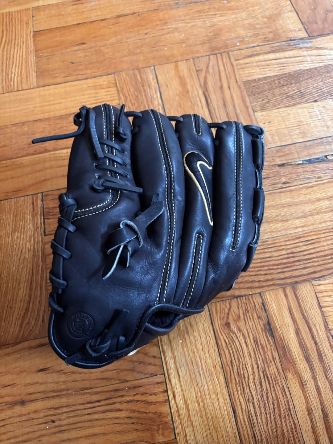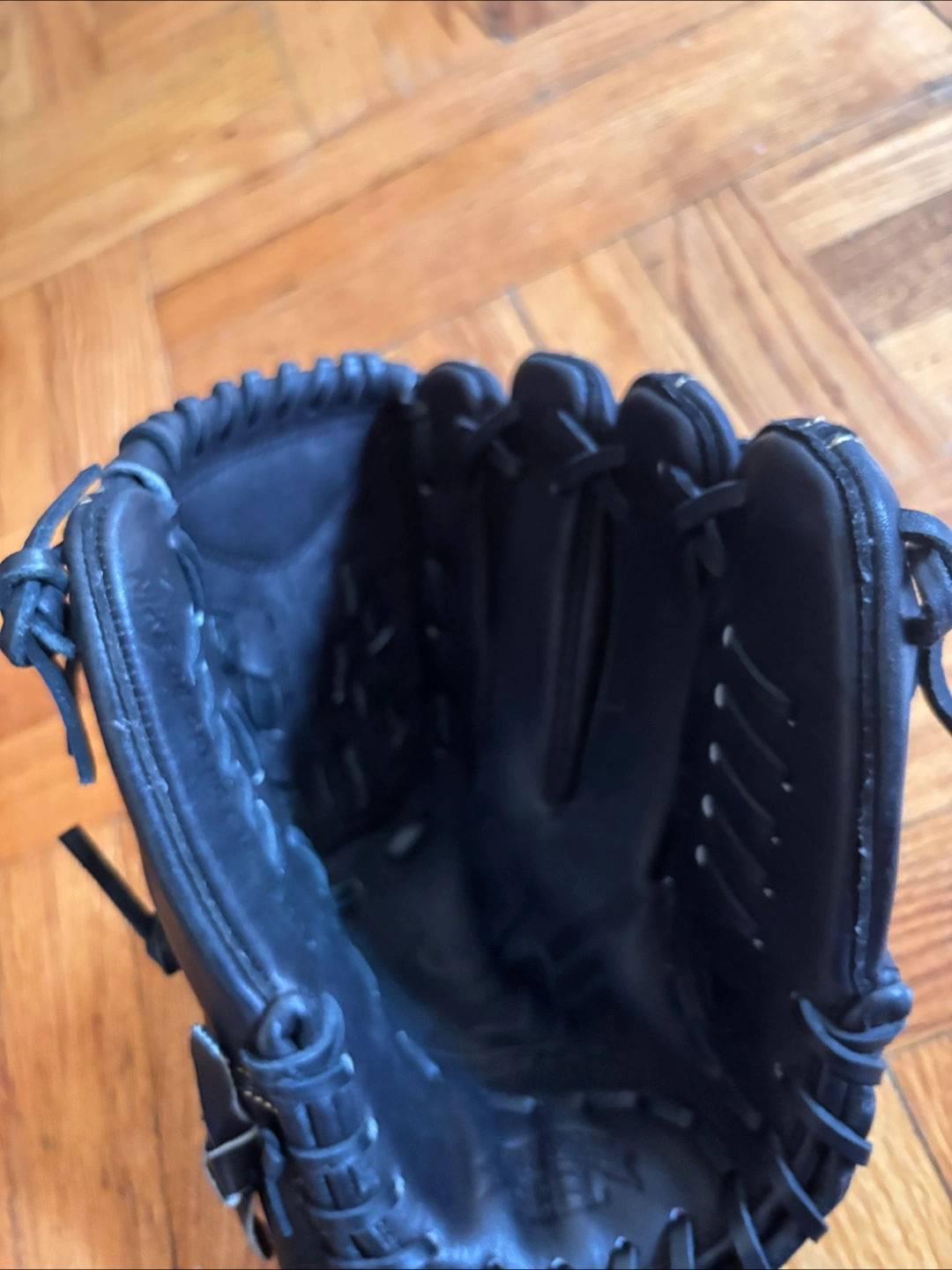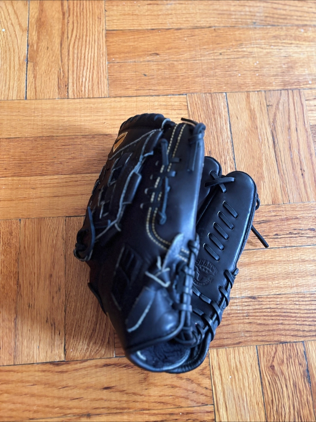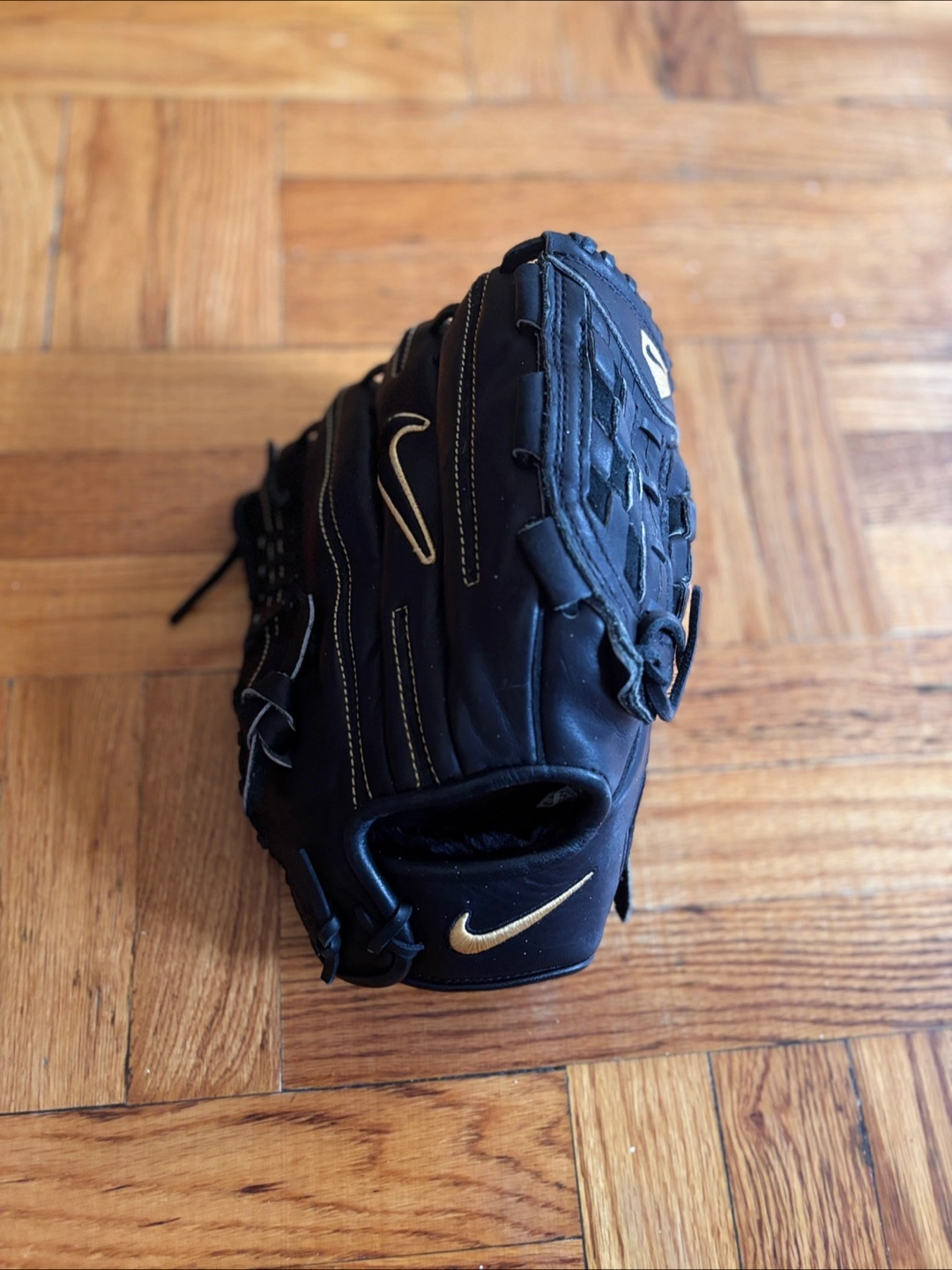 Black leather softball glove. Gold accents. Good condition. Baseball Glove Right H Throw. Ready to play.