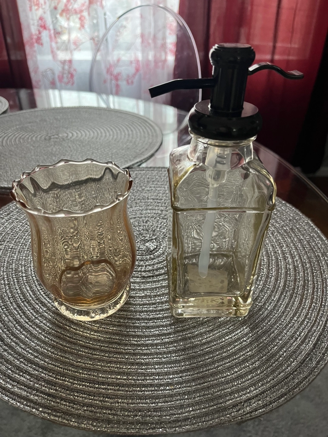 15Amber glass tumbler and clear glass soap dispenser with black pump. Perfect for bathroom or kitchen.