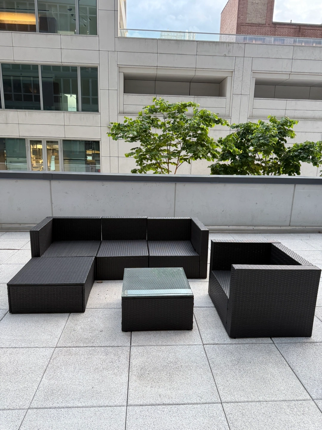Six-piece outdoor patio furniture set. Includes sectional sofa, loveseat, and glass-top coffee table. Brown wicker material. Modern design. Perfect for apartment balconies or small patios.