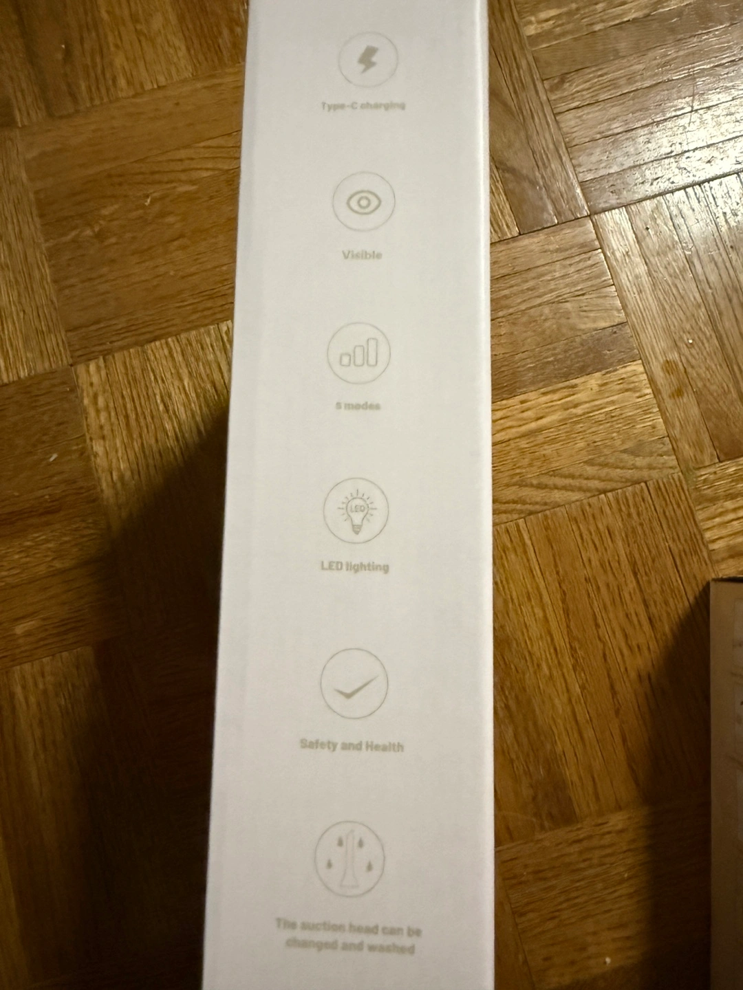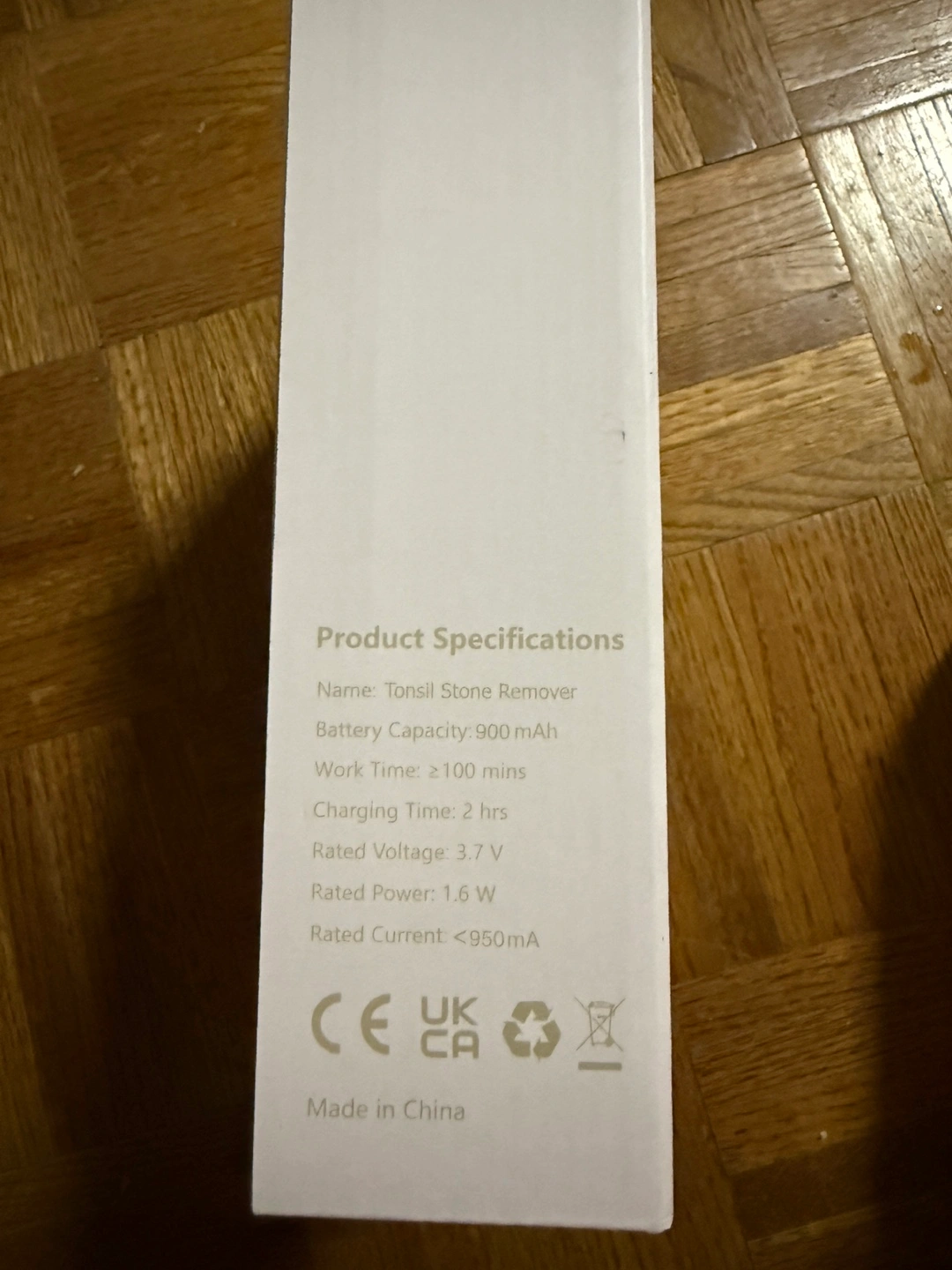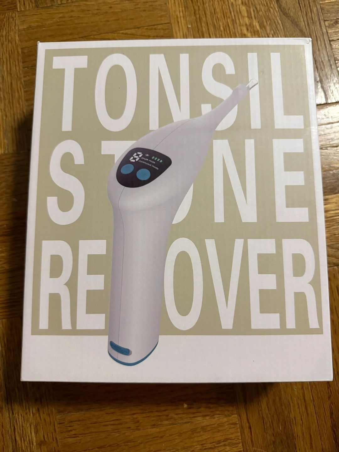 New tonsil stone remover. Features LED lighting, 5 modes, and type-C charging. Battery capacity: 900 mAh. Work time: 100 mins. Charging time: 2 hours. Suction head washable.