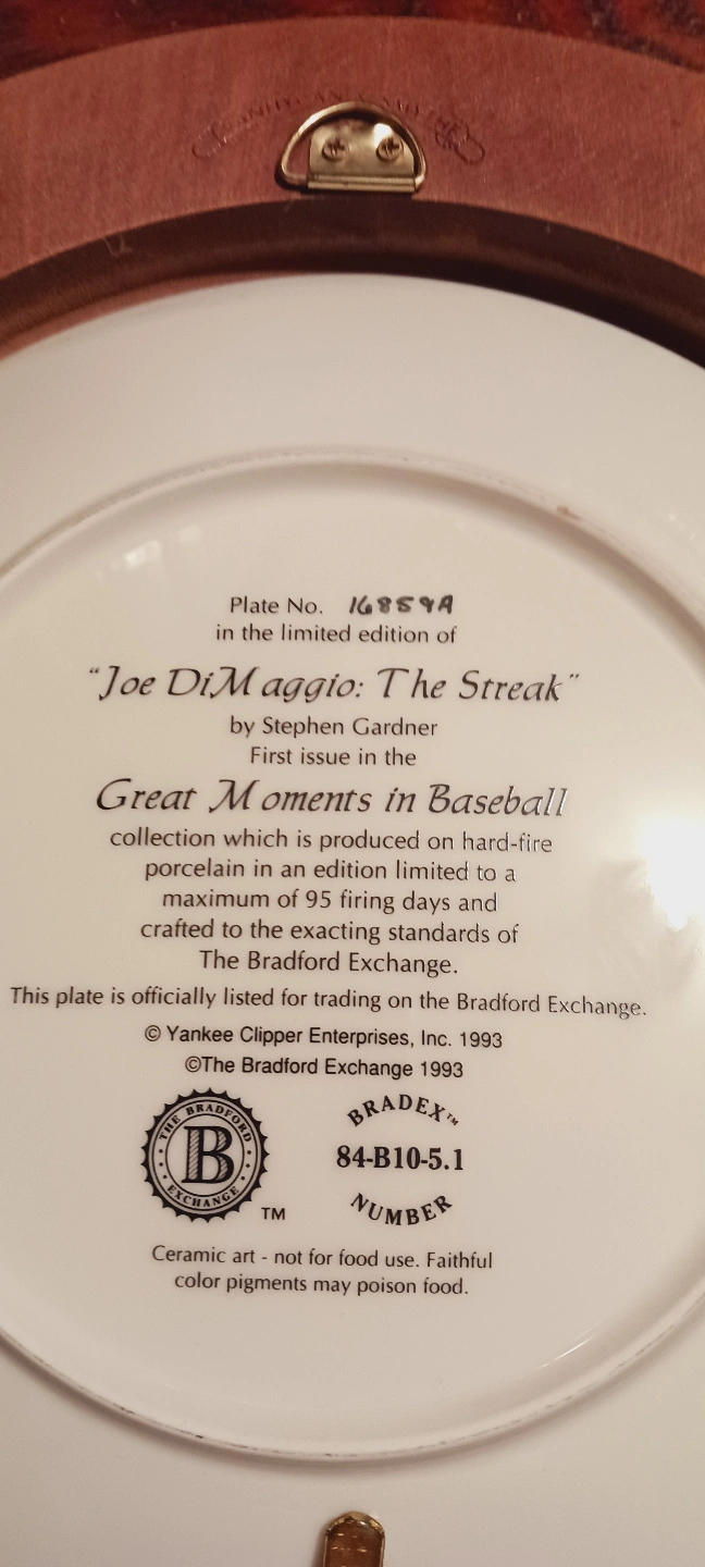 GIVE ME YOUR OFFER !!! BEST OFFER !!! PRICE IS NEGOTIABLE !!! Limited edition rare collectible plate. Features Joe DiMaggio at bat. Hard-fire porcelain. Plate number 165594. From the Great Moments in Baseball collection. Excellent Mint condition. It is Framed. Ready to hang on the wall. 11" diameter. ALL MY PRICES ARE NEGOTIABLE !!!