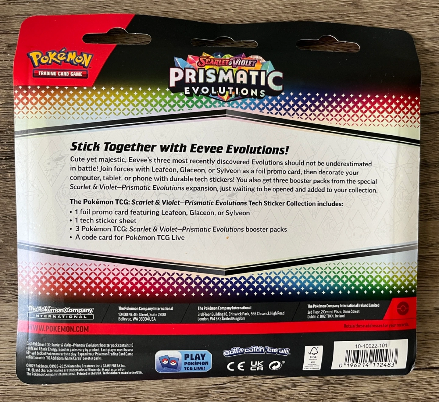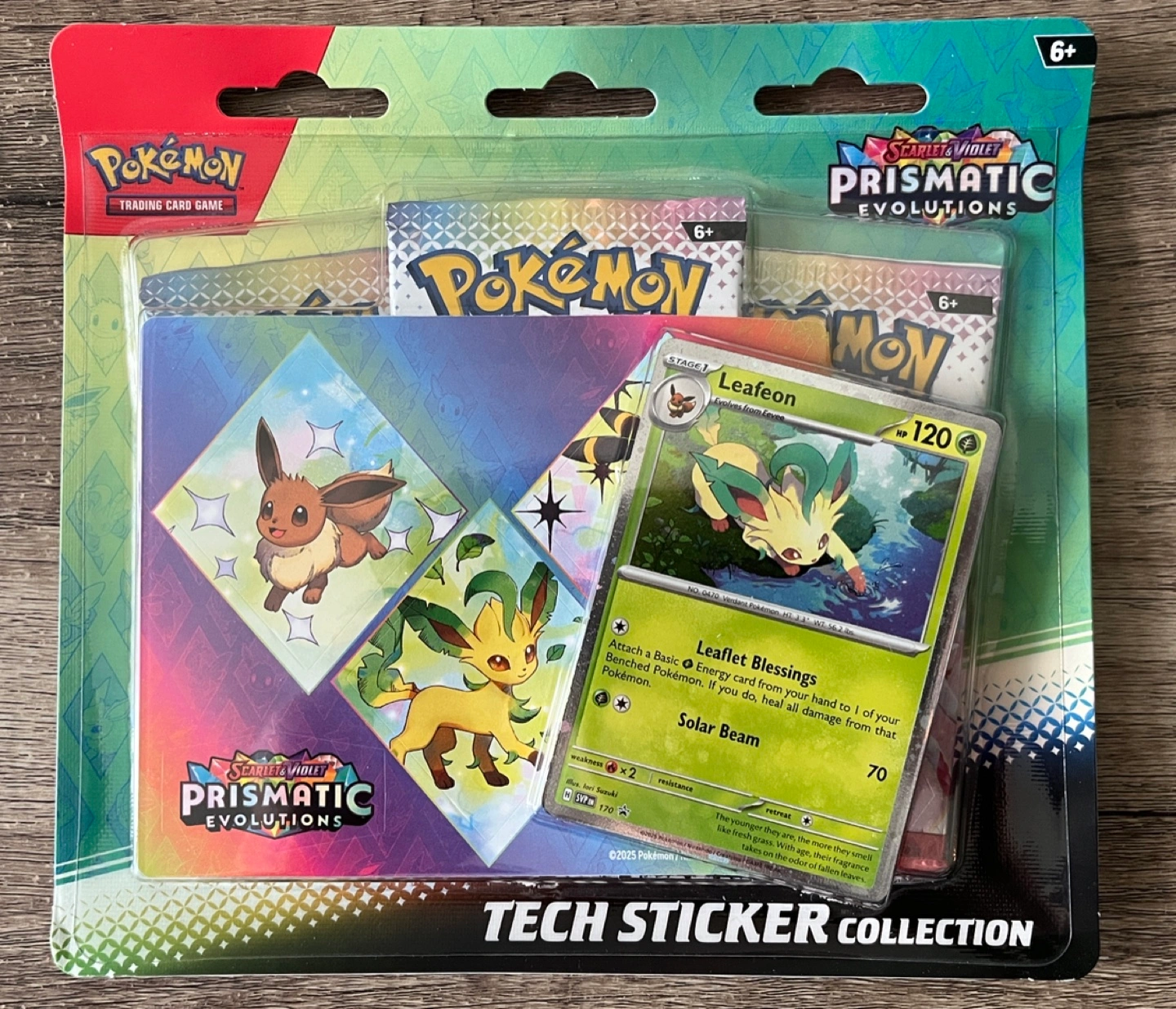 Sealed. Includes 3 Prismatic Evolutions booster packs, 1 Leafeon foil promo card, 1 sticker sheet and 1 code card.