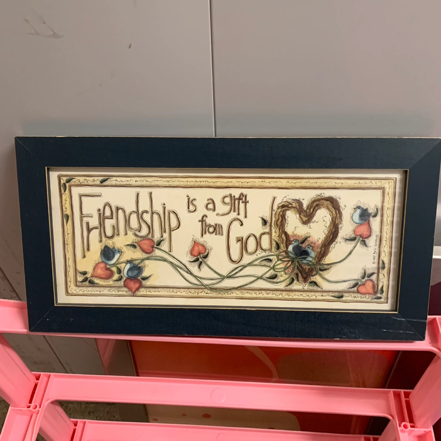 Wall art featuring birds, hearts, and the quote, "Friendship is a gift from God." Dark blue frame.