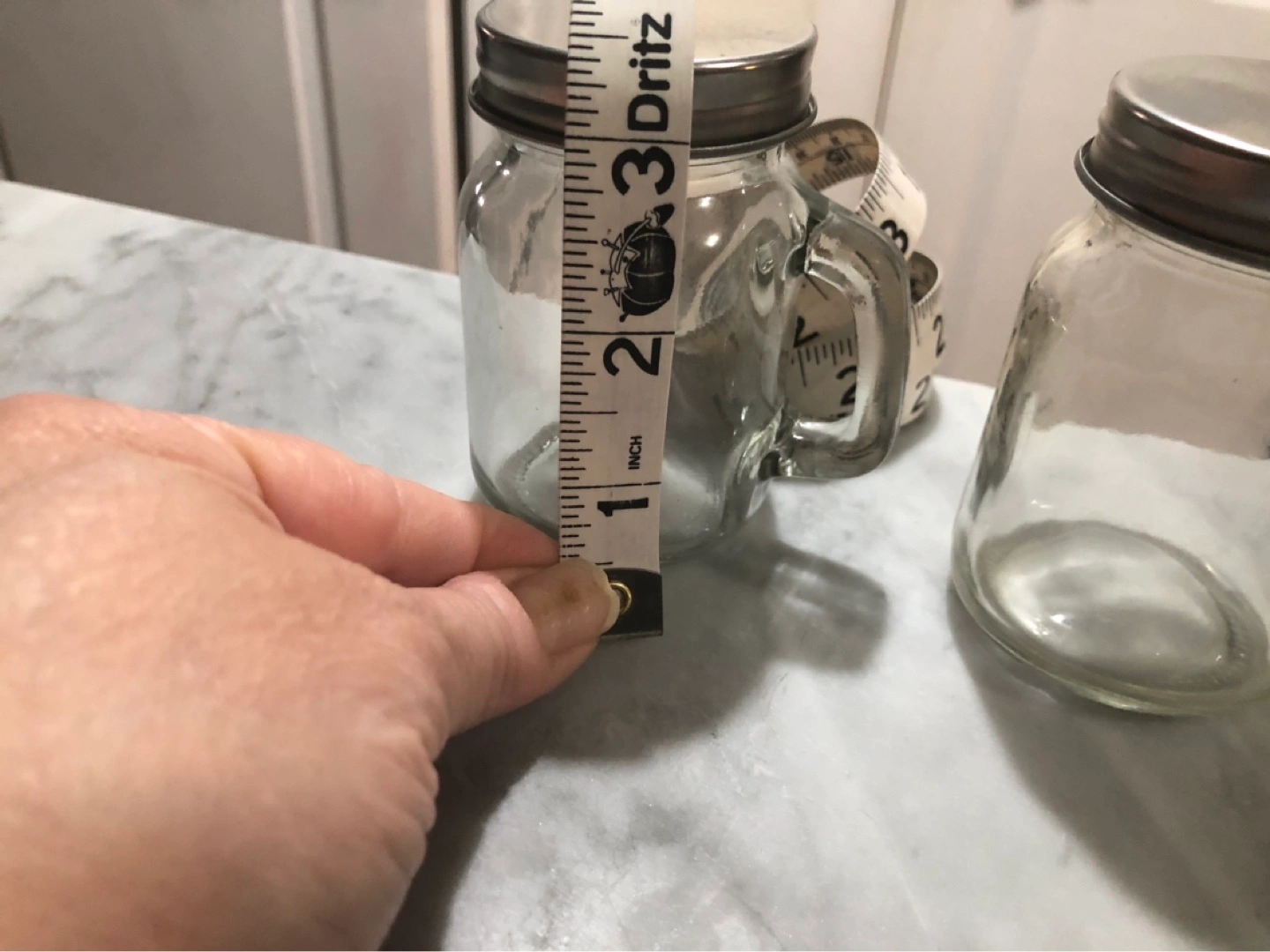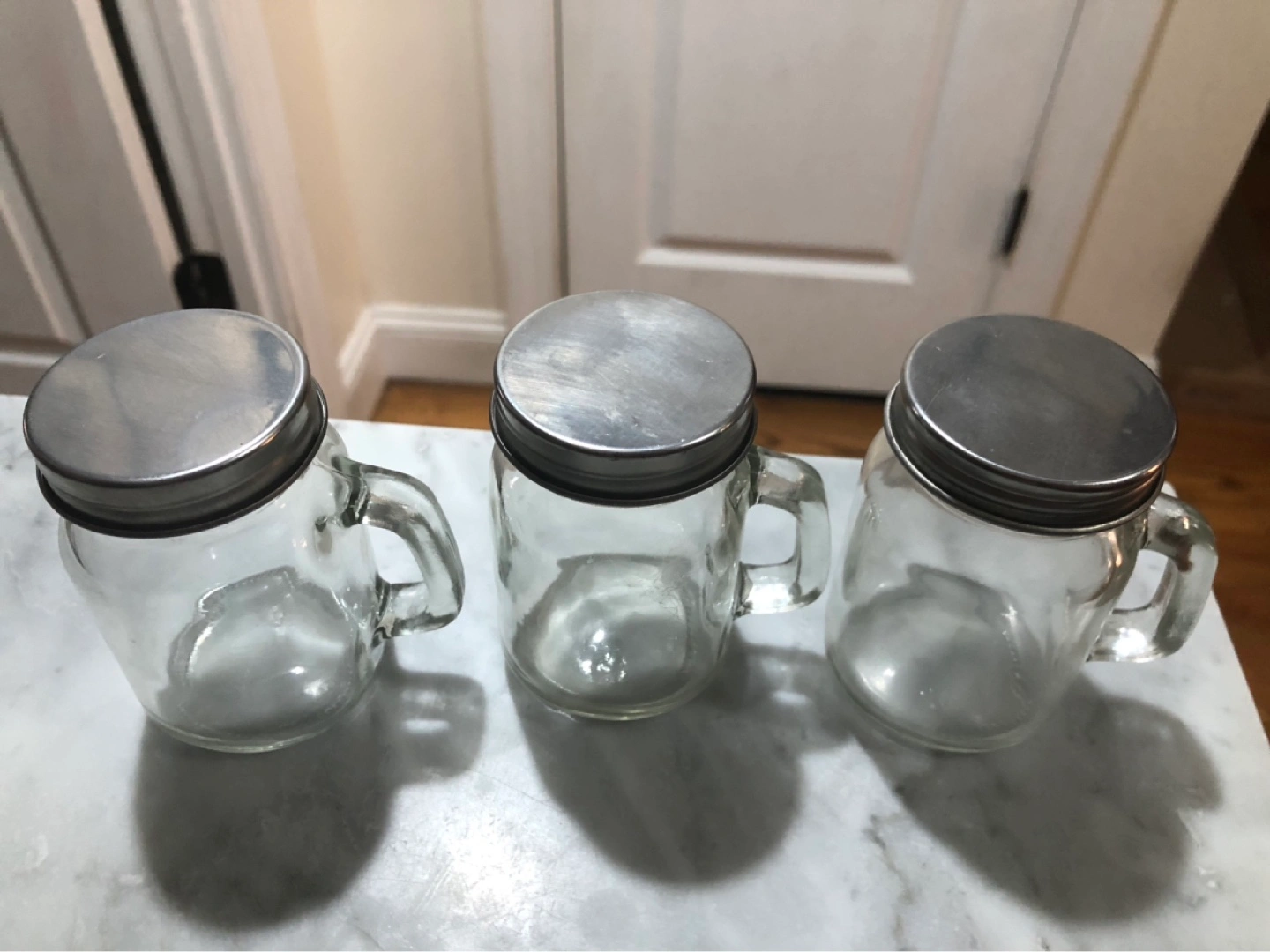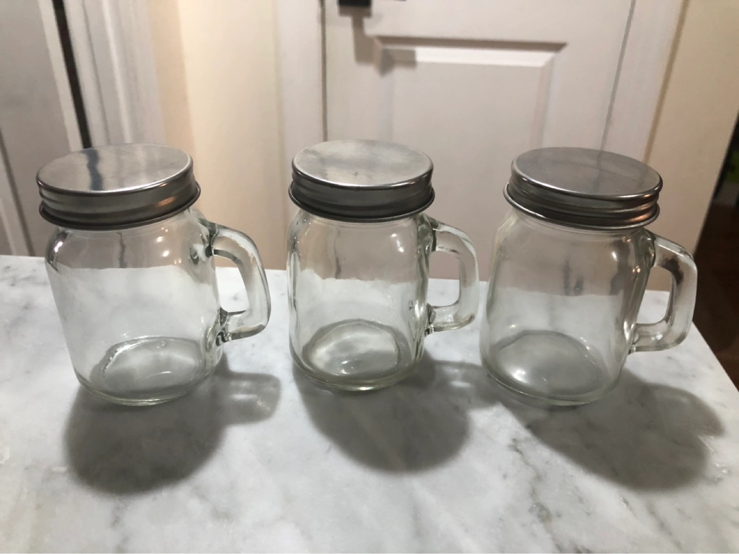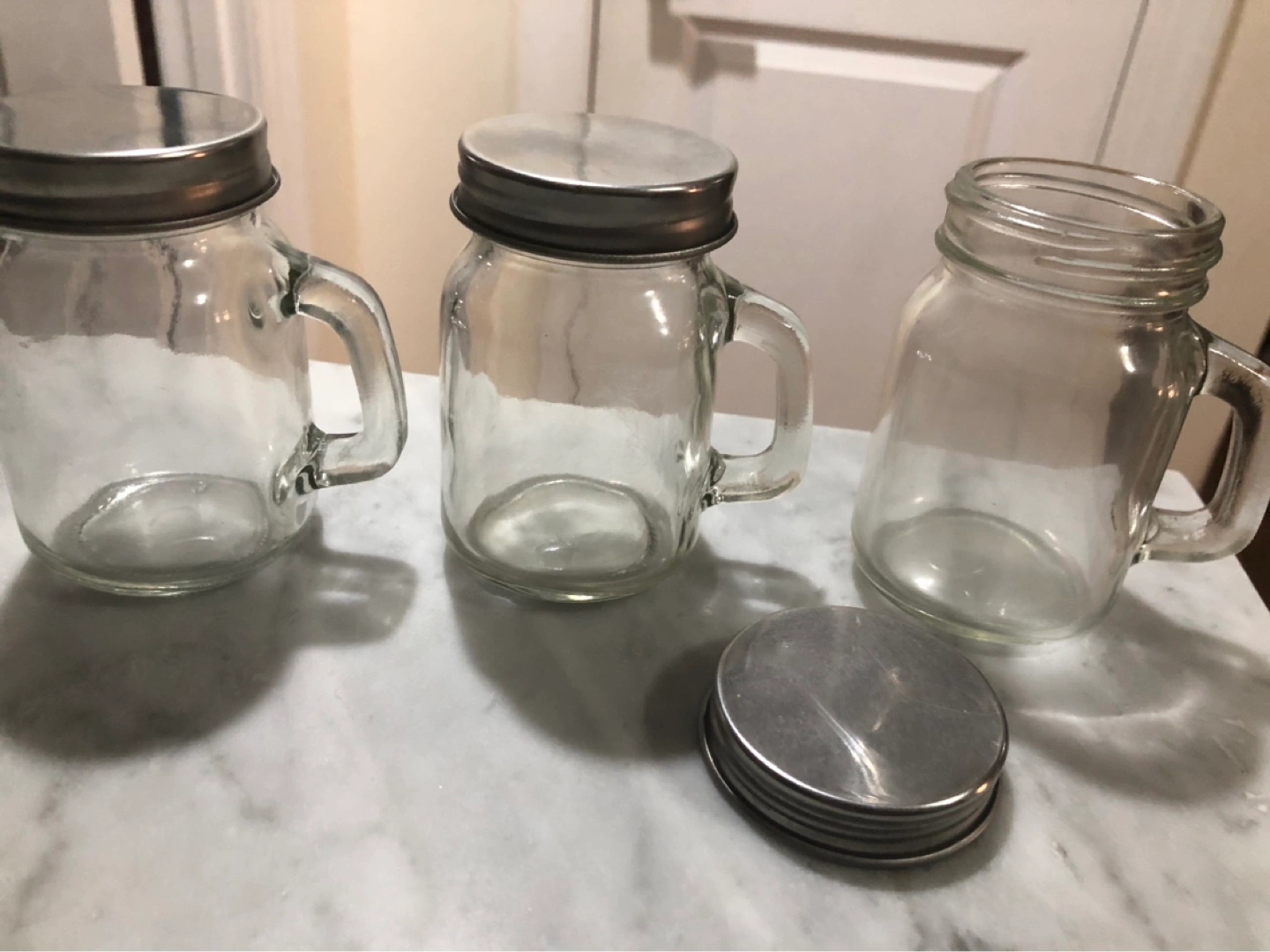Three mini glass mason jar mugs with handles and metal lids.