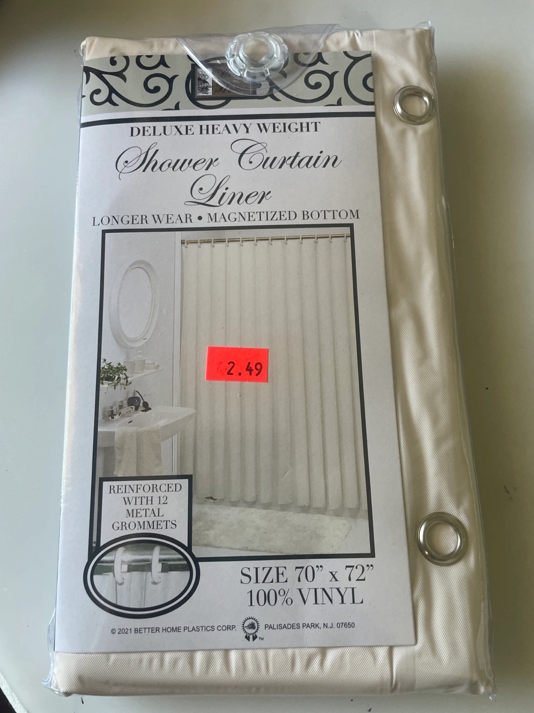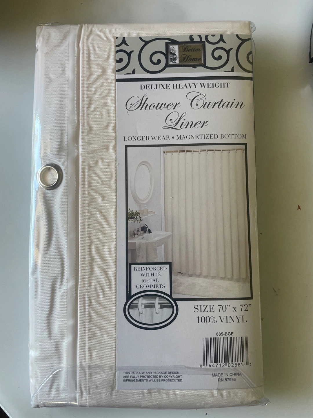 60Off-white shower curtain liner. Heavy weight, magnetized bottom. Reinforced with 12 metal grommets. 100% vinyl. 70 inches by 72 inches.