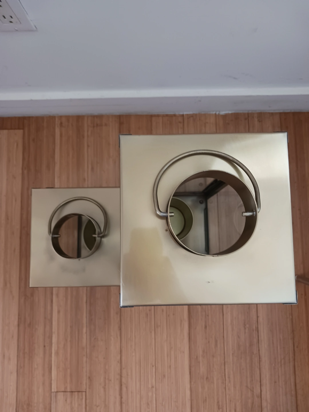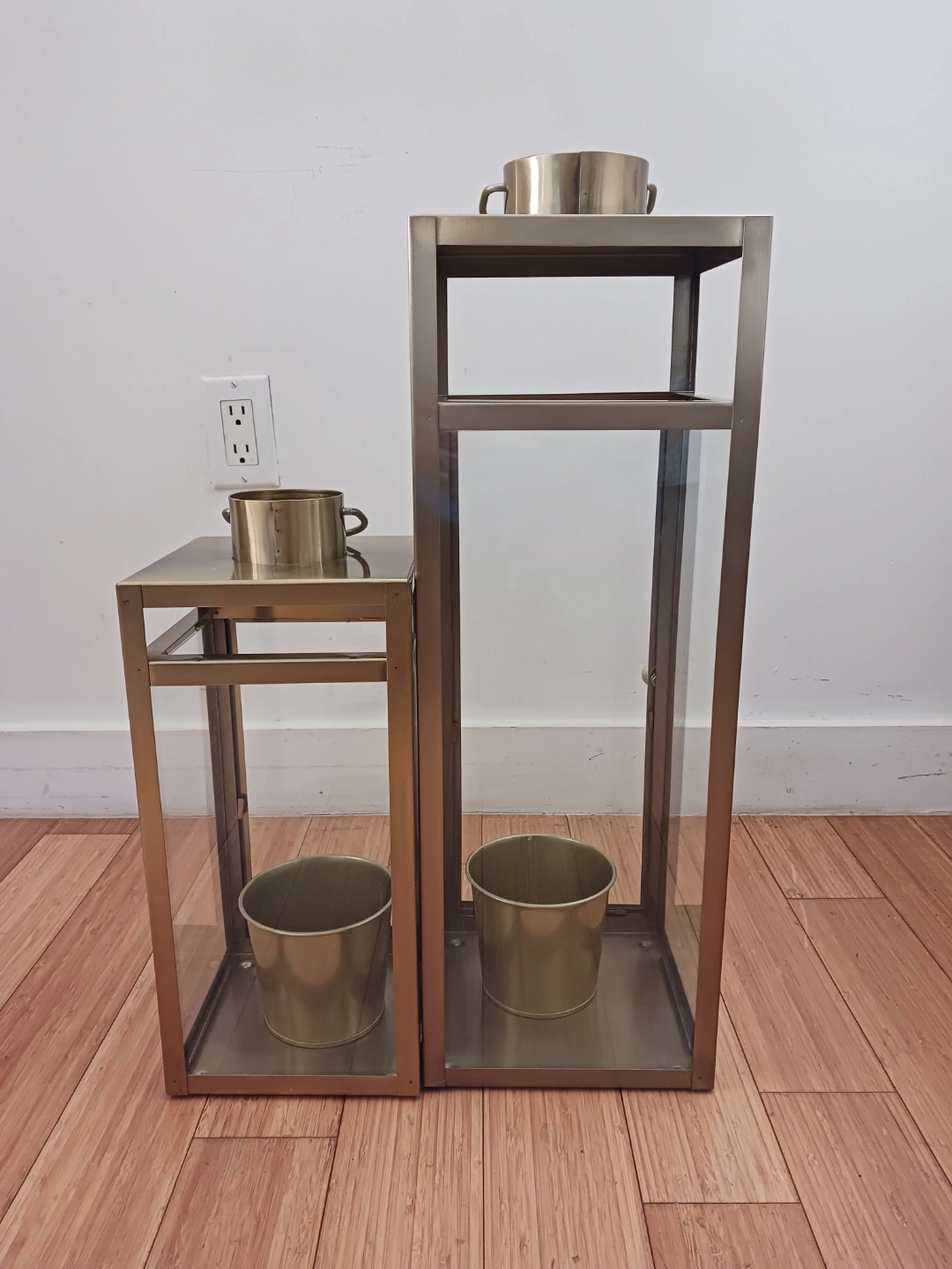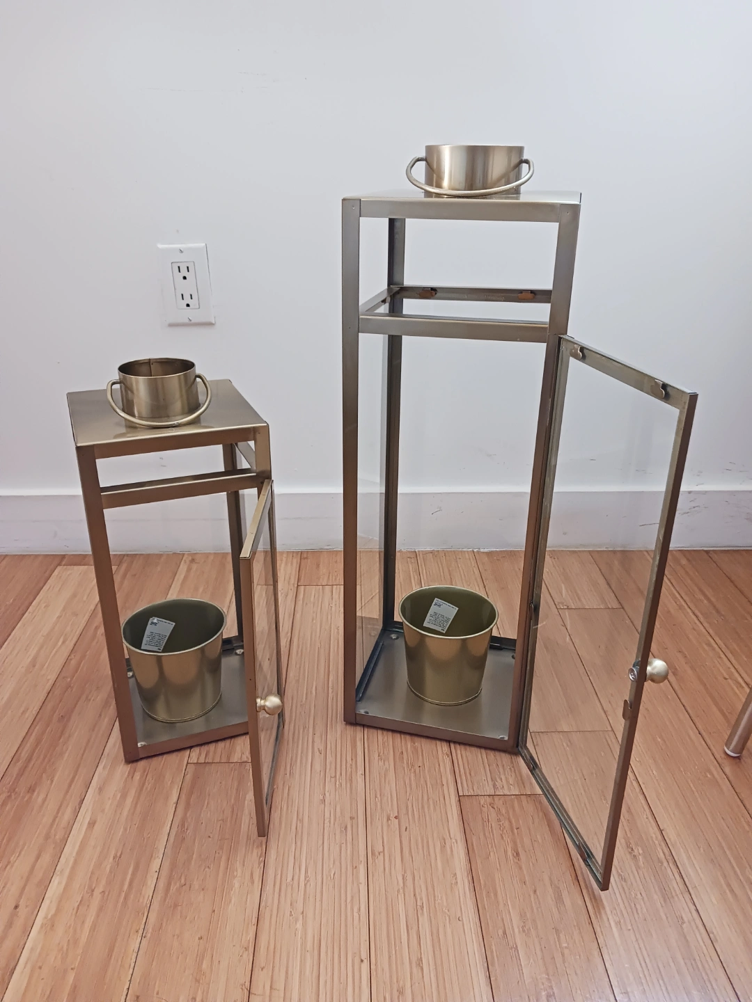 Two gold metal lanterns, varying in size. Glass panels. Metal containers included. Perfect for candles or decor.