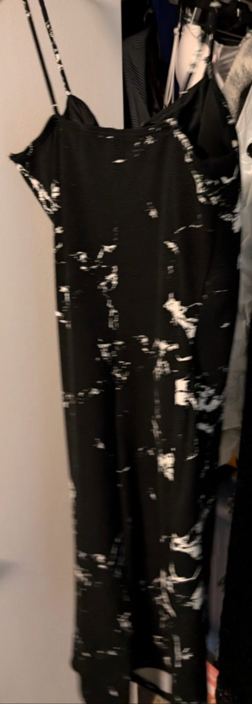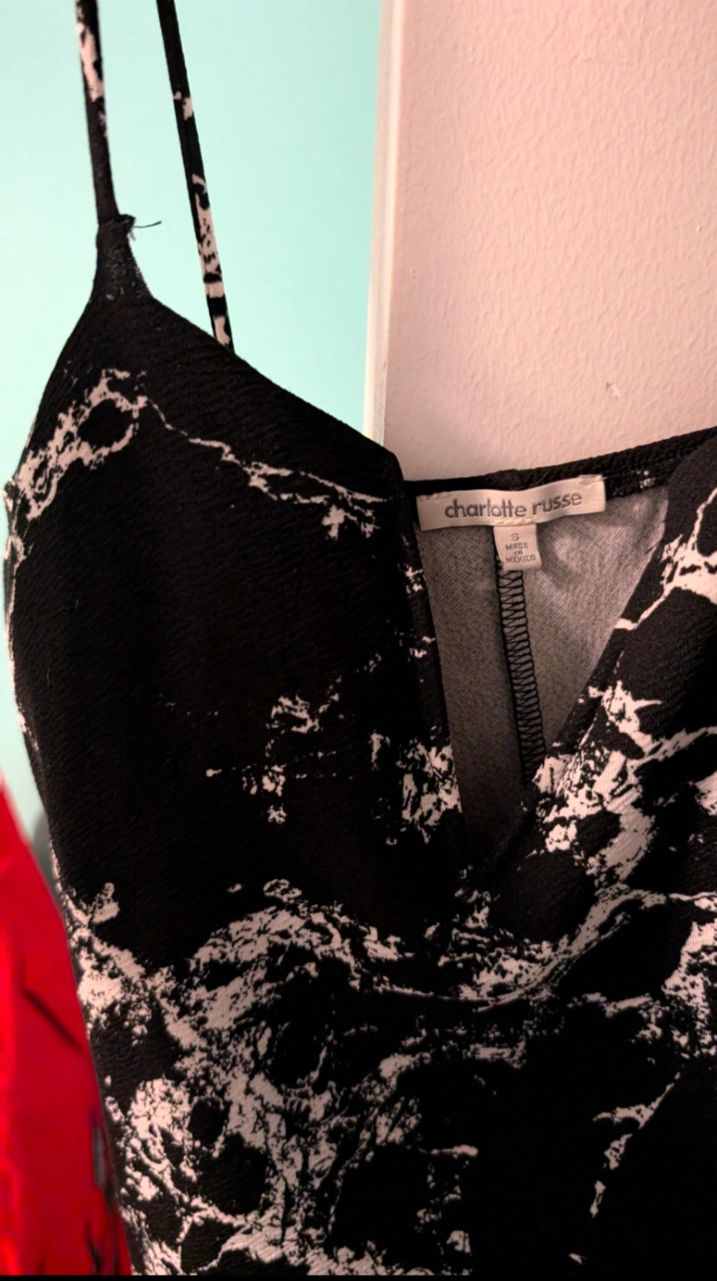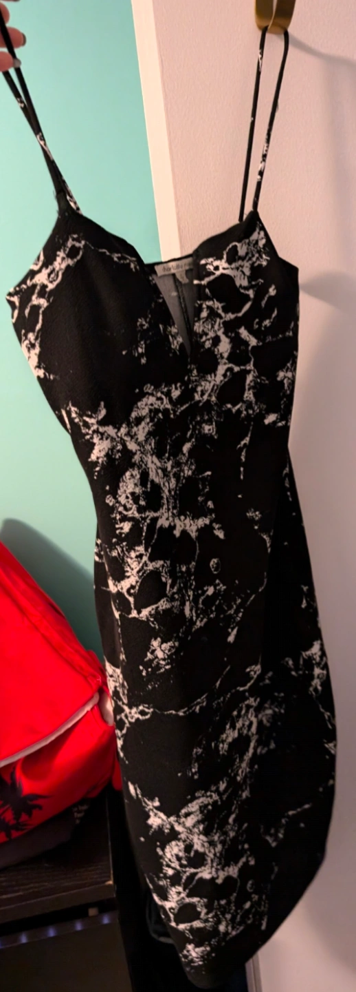 Black mini dress with spaghetti straps. White marble print. Labeled size small but has a good amount of stretch to it. From home with dogs. Chicago North Center near Damen & Montrose