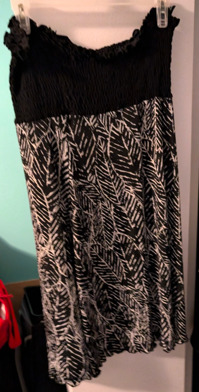 68Women's black and white patterned mini dress. Features a stretchy smocked bodice and a flowy skirt. Great for summer. From home with dogs. North Center near Damen & Montrose