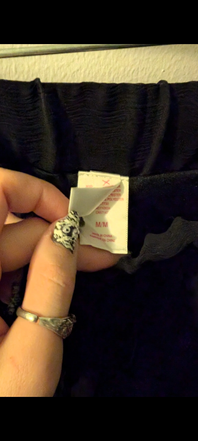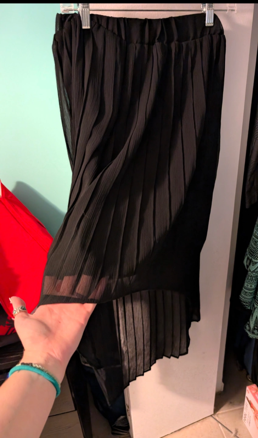 58Black pleated skirt. High-low hemline. Size medium. Elastic waistband. From home with dogs. North Center (Chicago) near Damen & Montrose