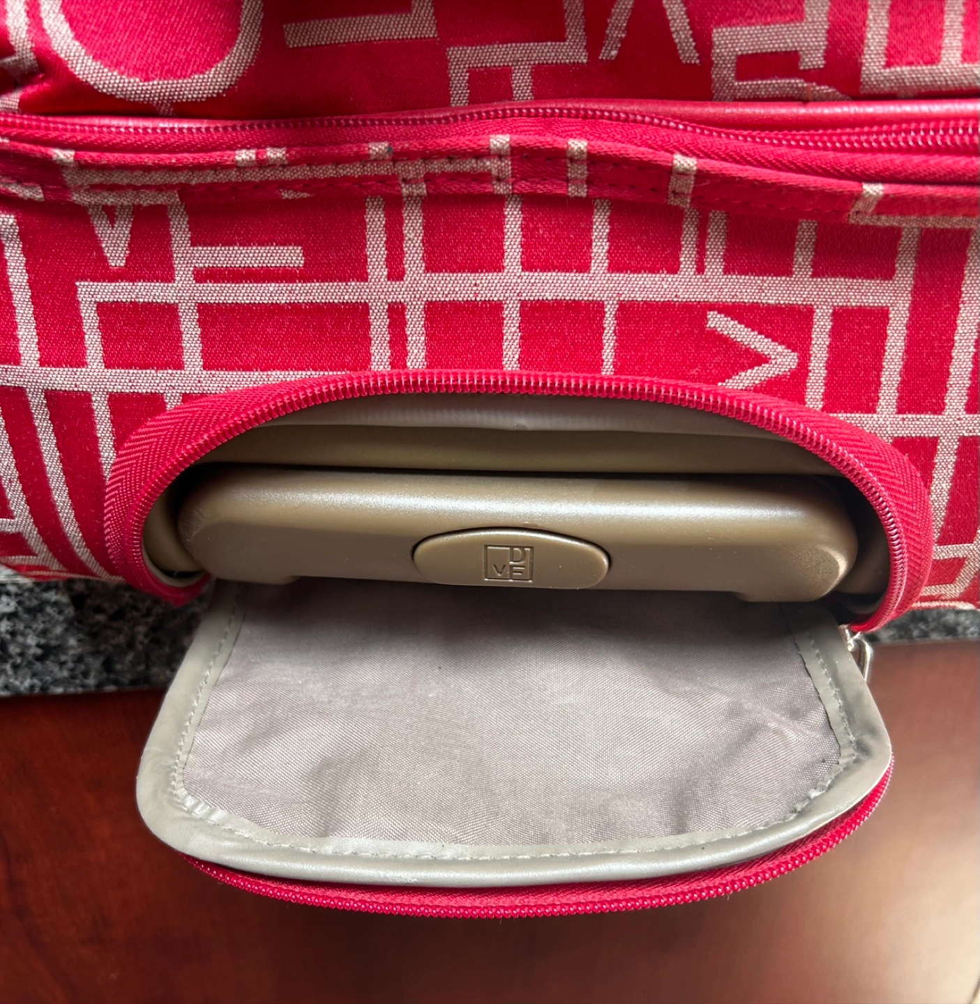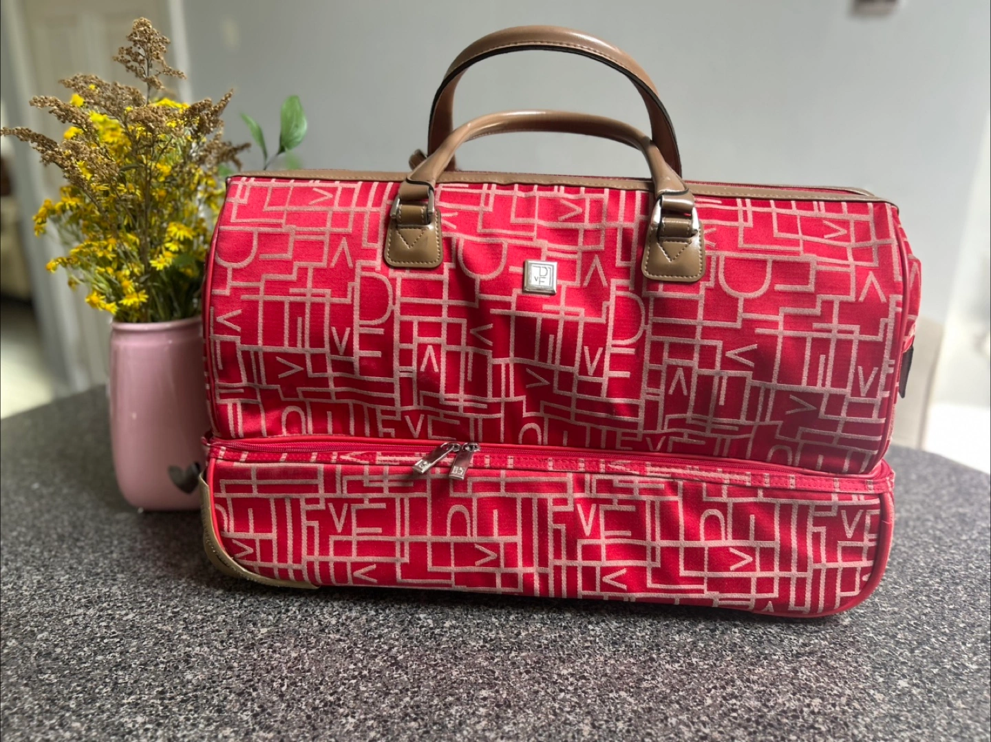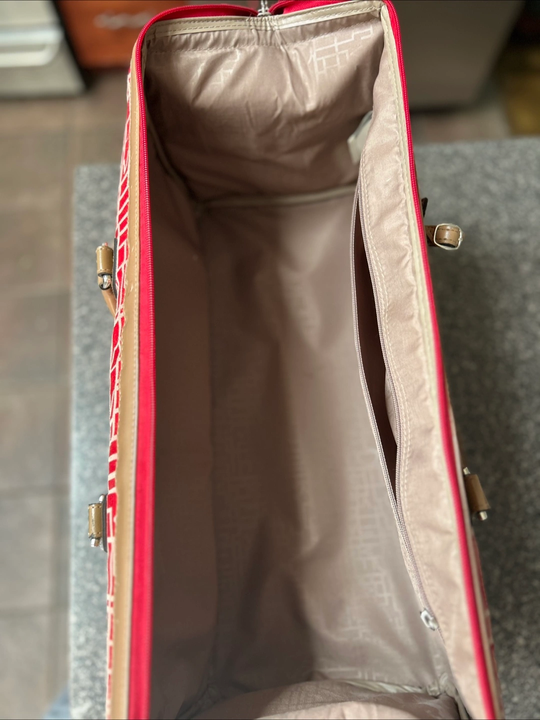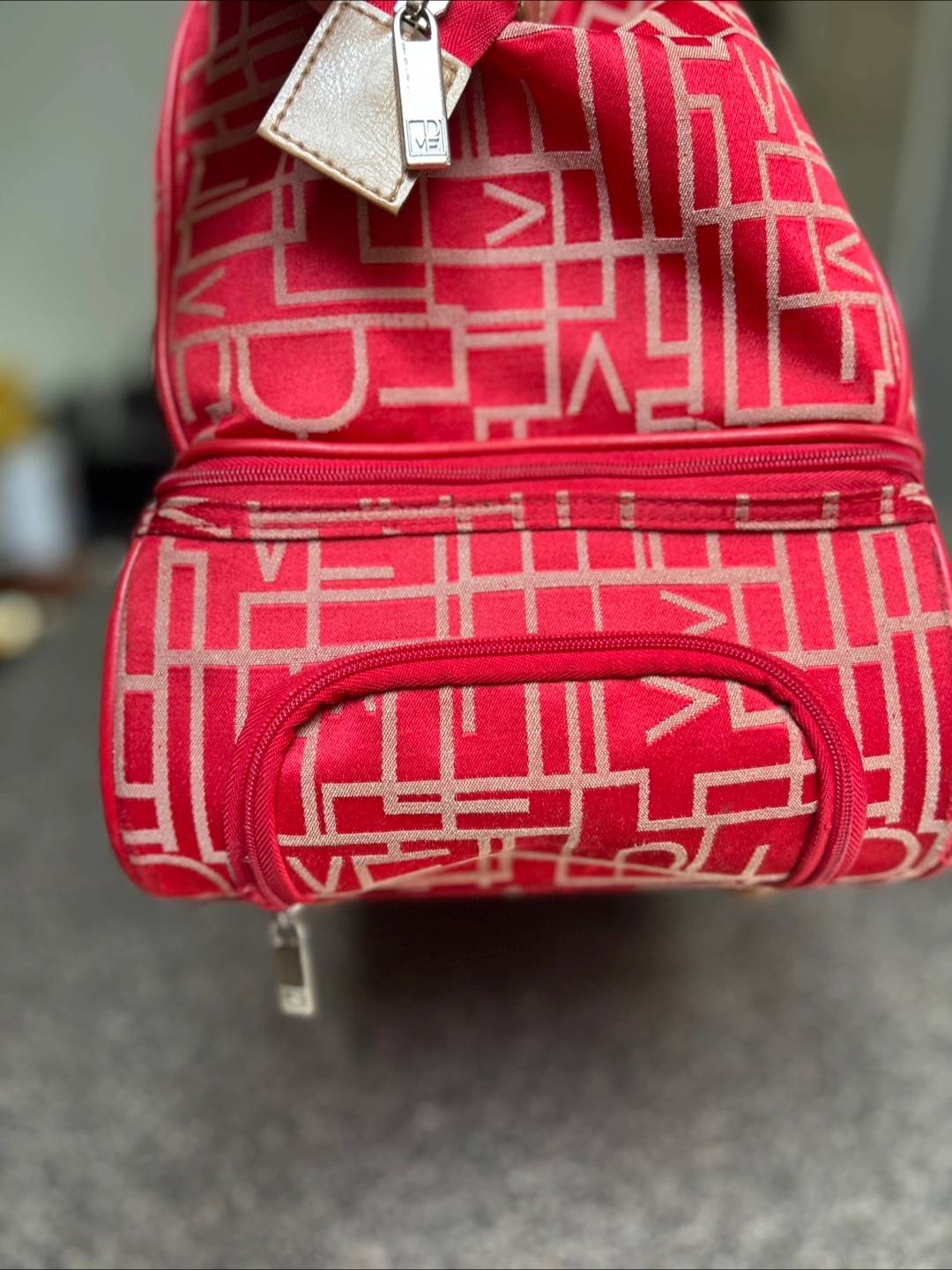 137Red and Linen Canvas Carry-on; practical as it is stylish with two separate compartments. A few signs of wear on the corners, no tears, everything works; still lots of life left.