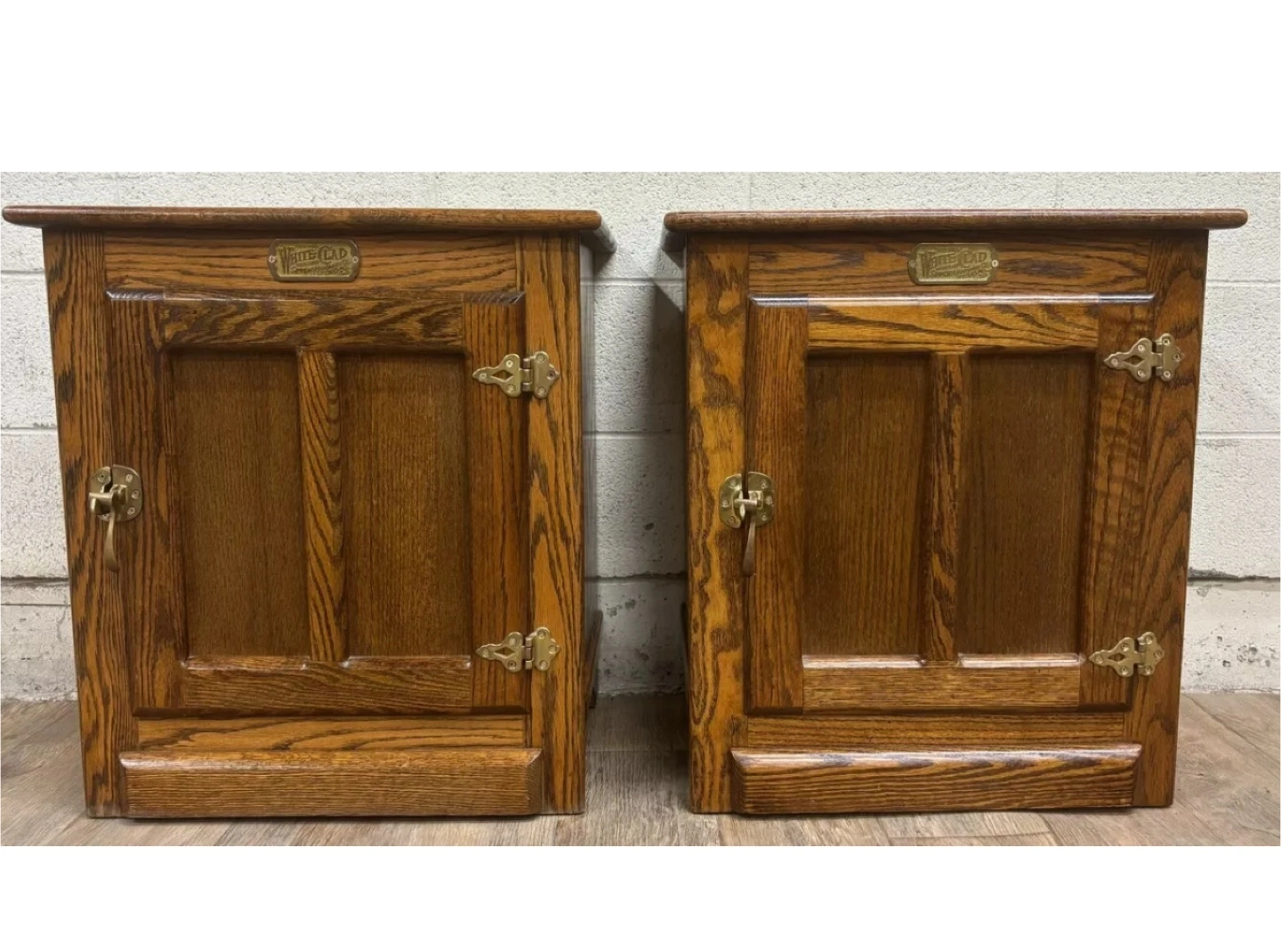 Pair of vintage oak nightstand . Brass hardware. St. Louis, MO. Solid wood white clad ice box nightstands