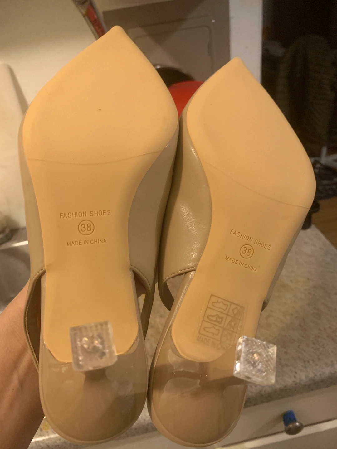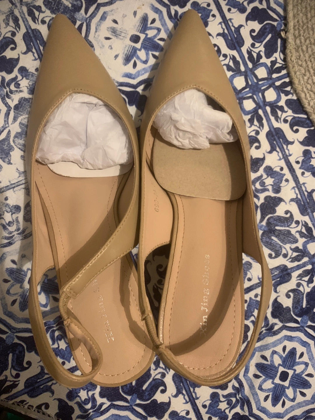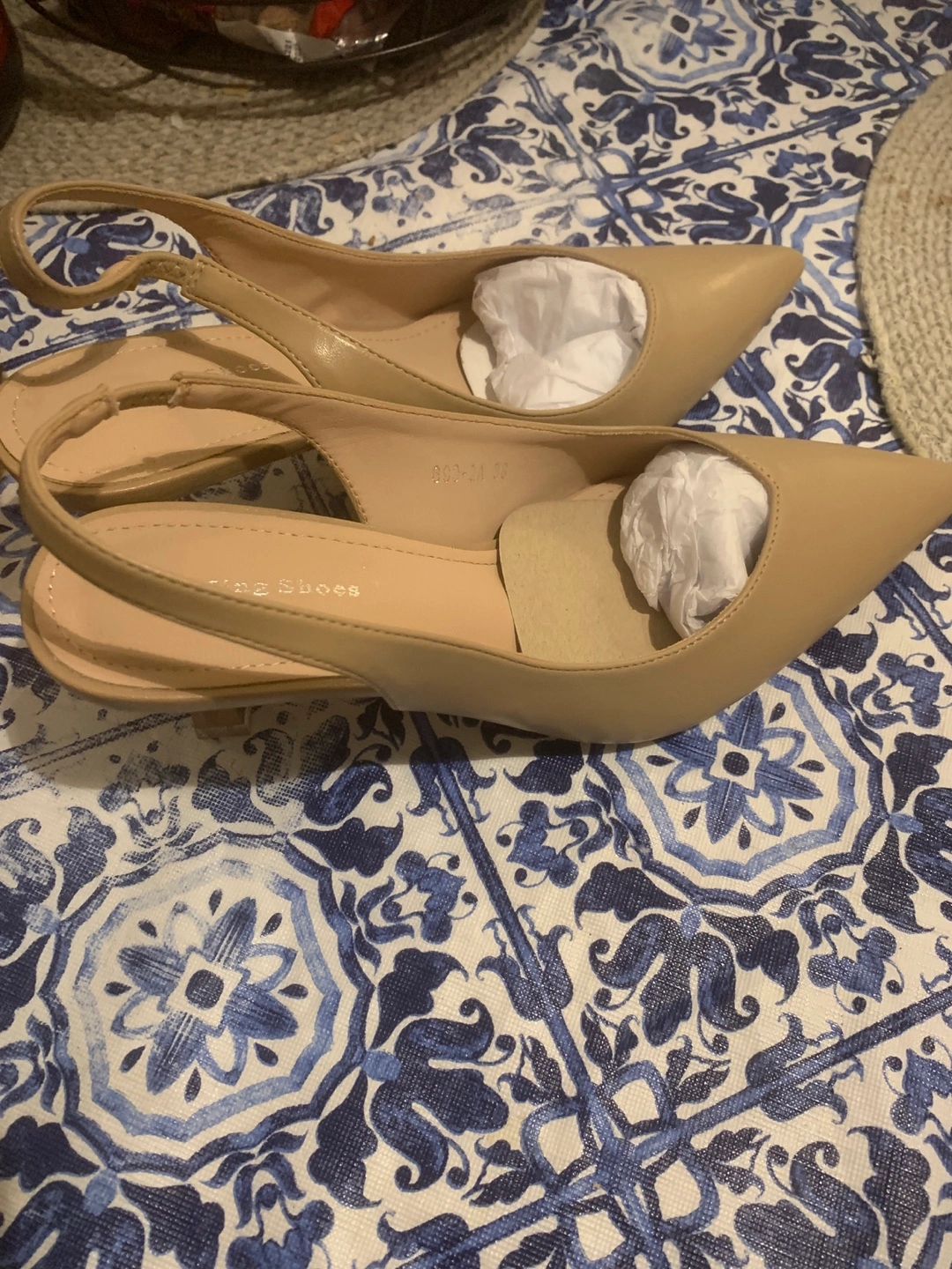 Nude colored slingback heels. Pointed toe. Low heel. Size 38. Made in China.