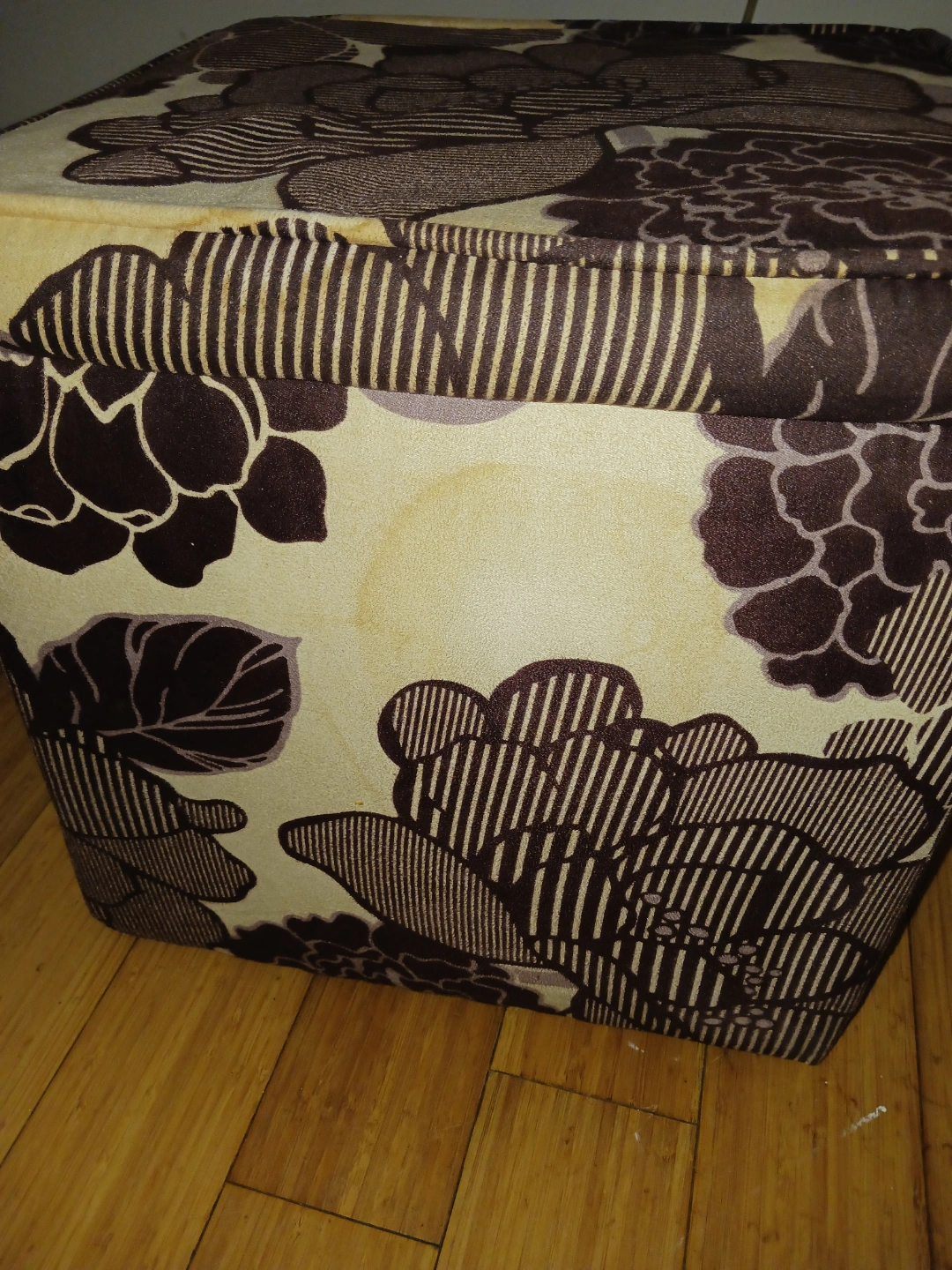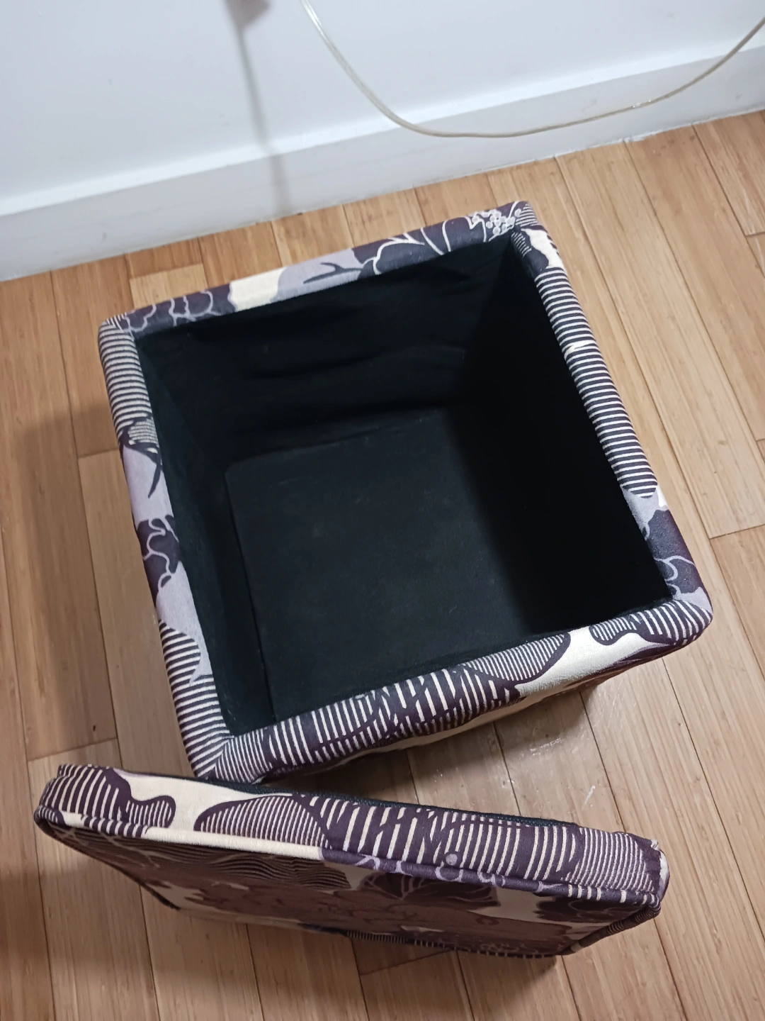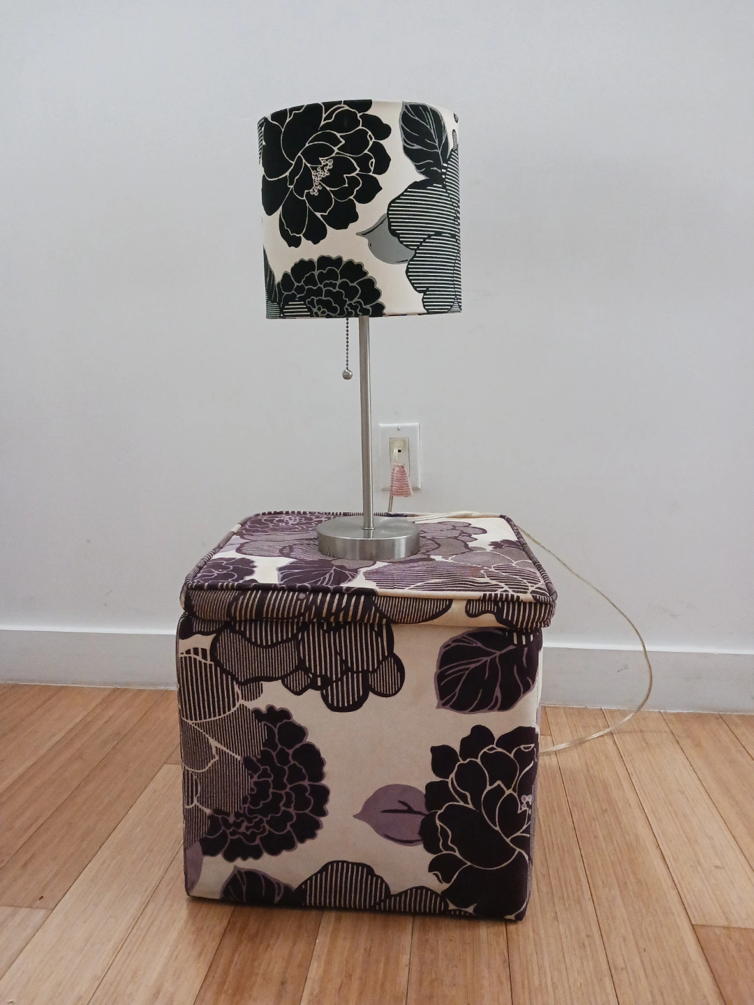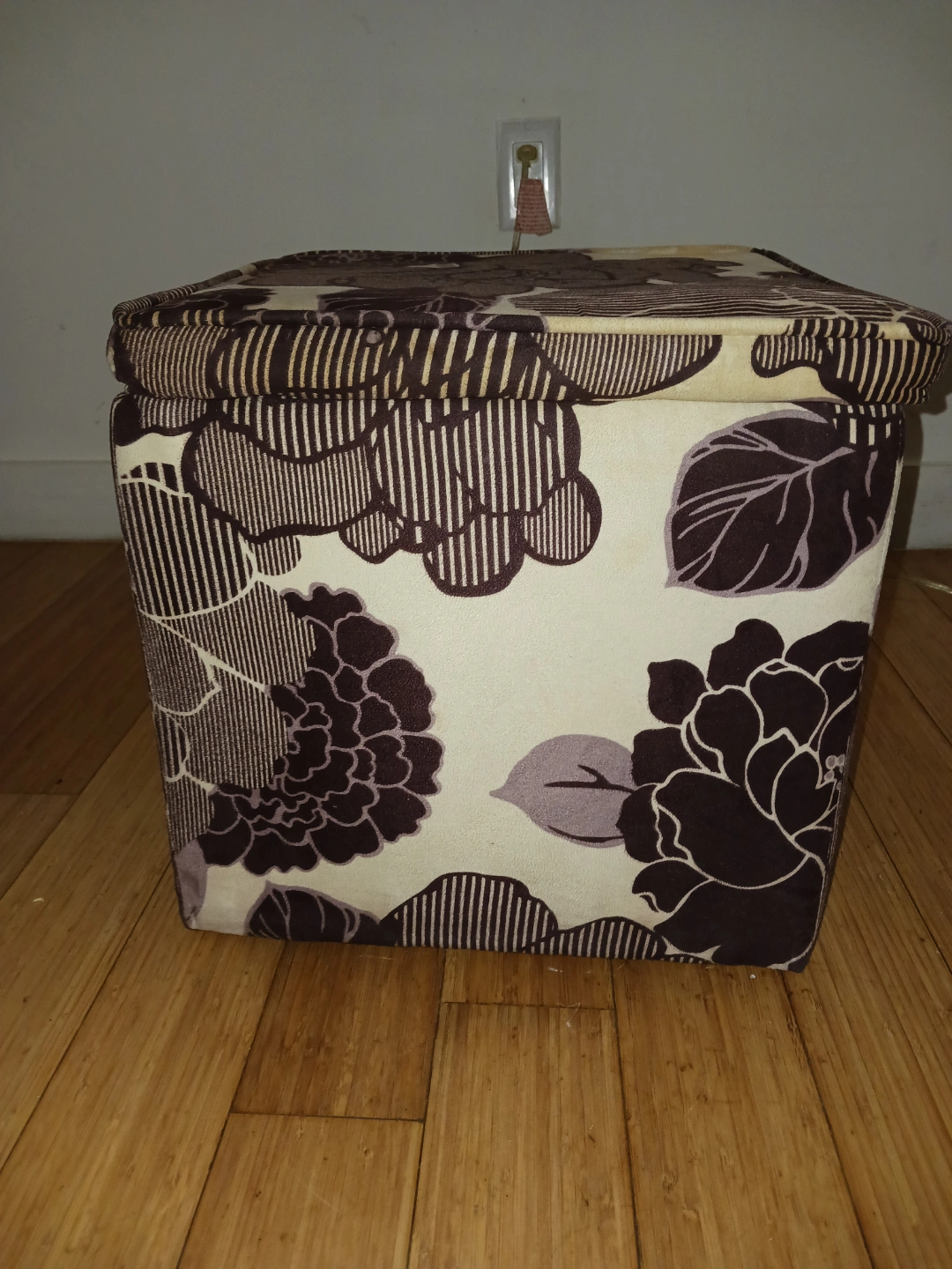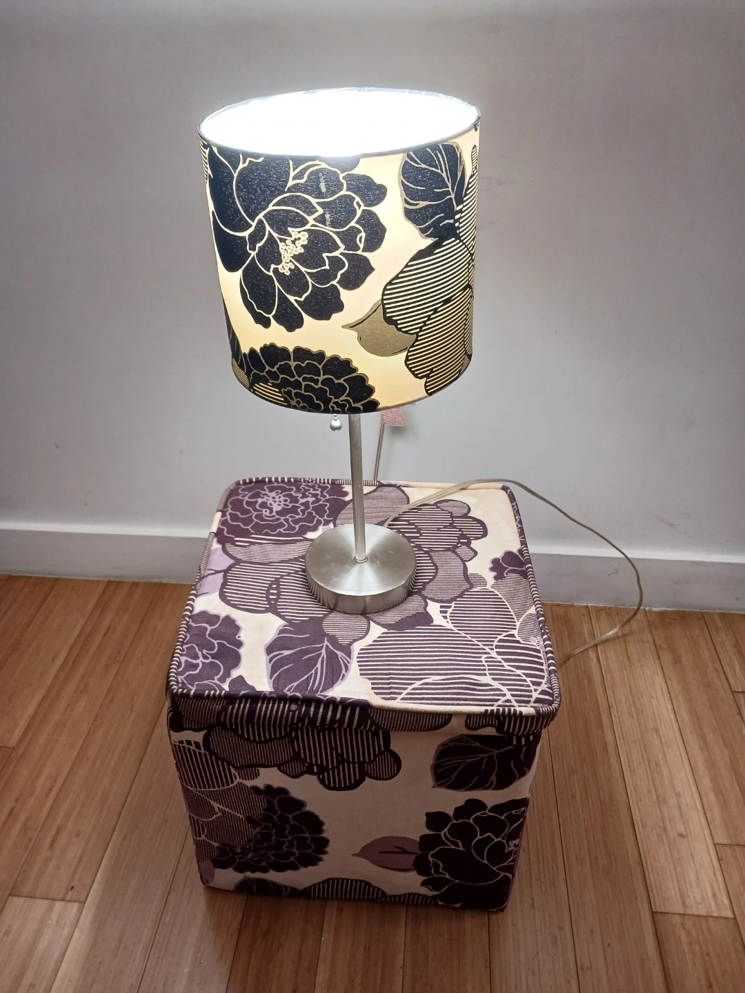 184Square fabric ottoman with storage. Features a floral print in shades of purple and cream. Matching table lamp included. Silver metal base.