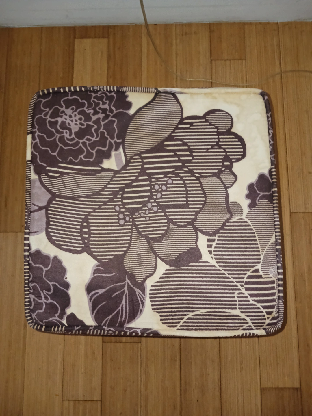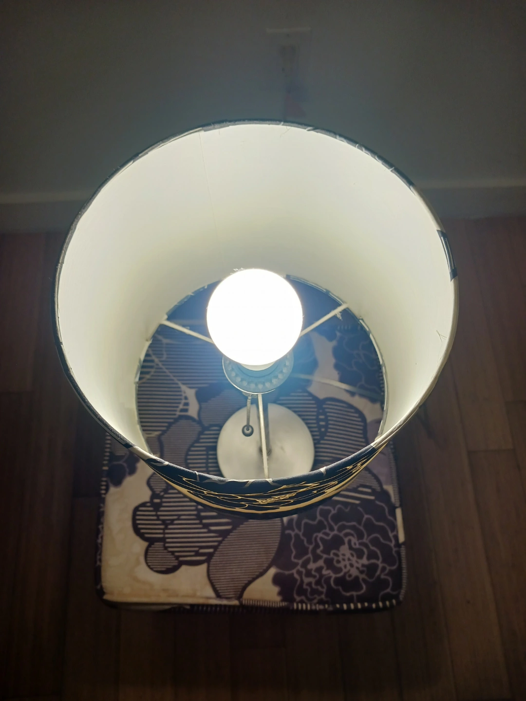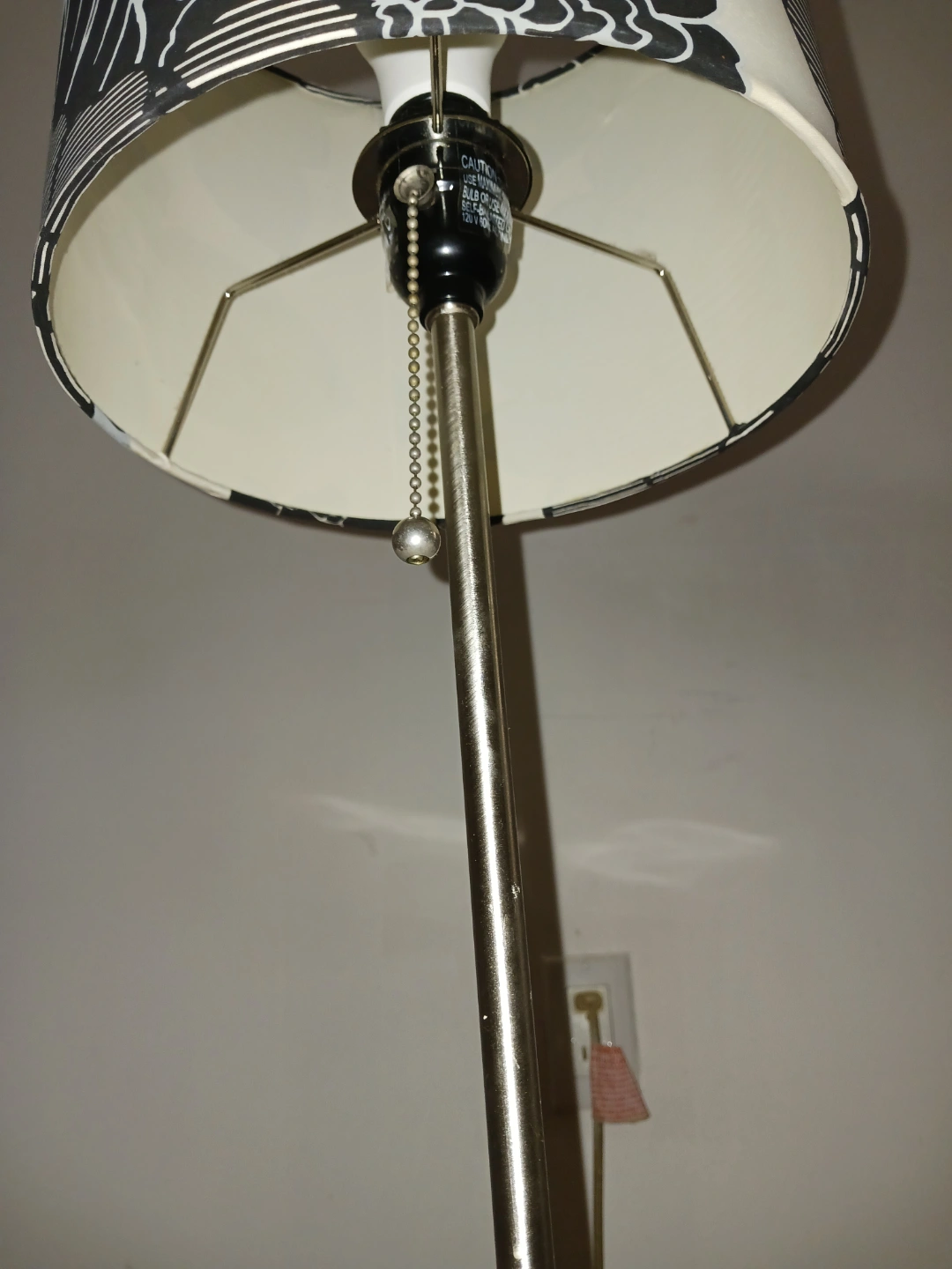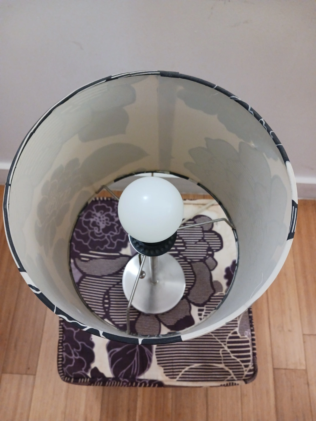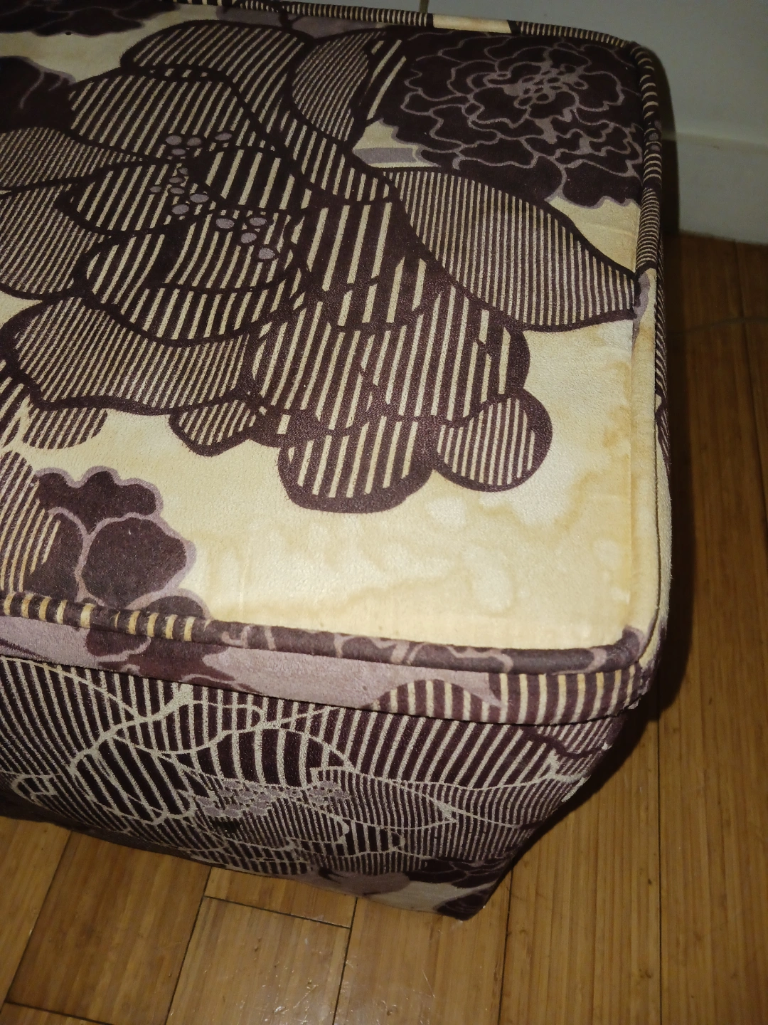 184Square fabric ottoman with storage. Features a floral print in shades of purple and cream. Matching table lamp included. Silver metal base.