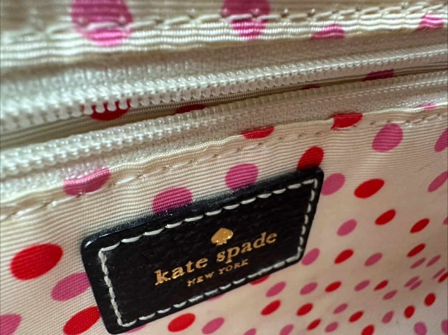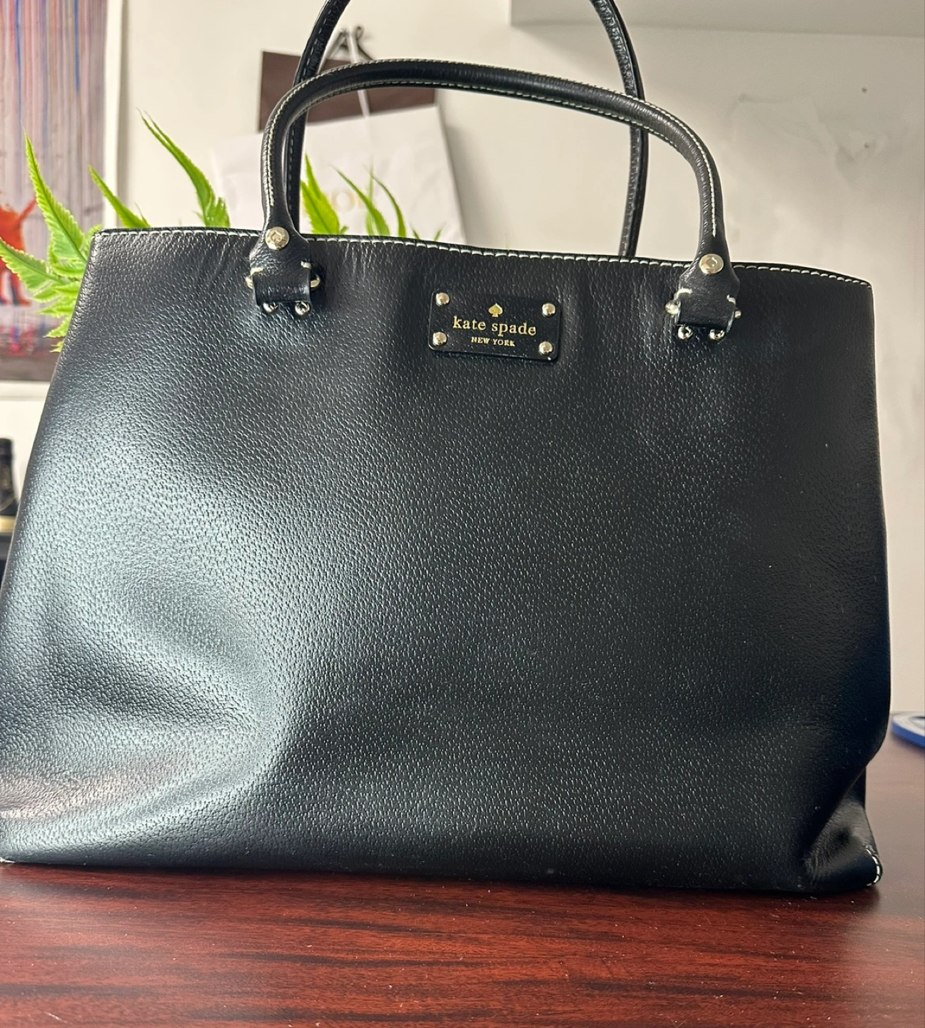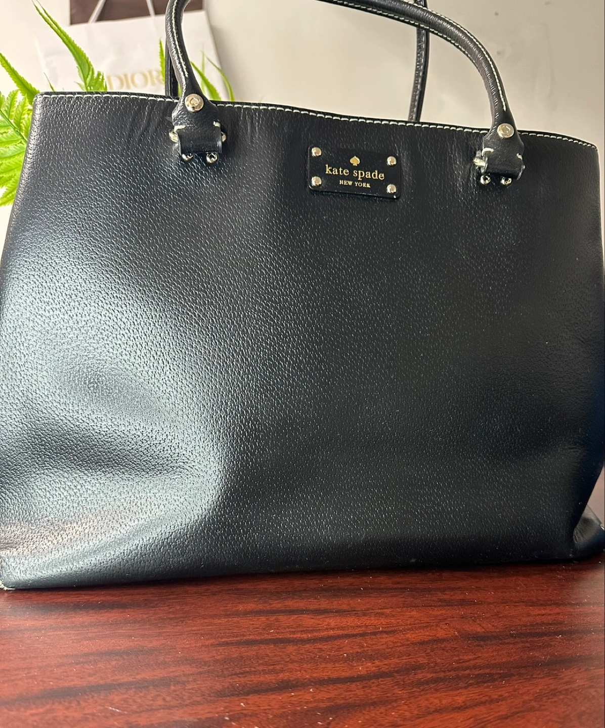 188Black leather tote bag. Double top handles. Subtle branding. Interior lining features a polka dot pattern.
