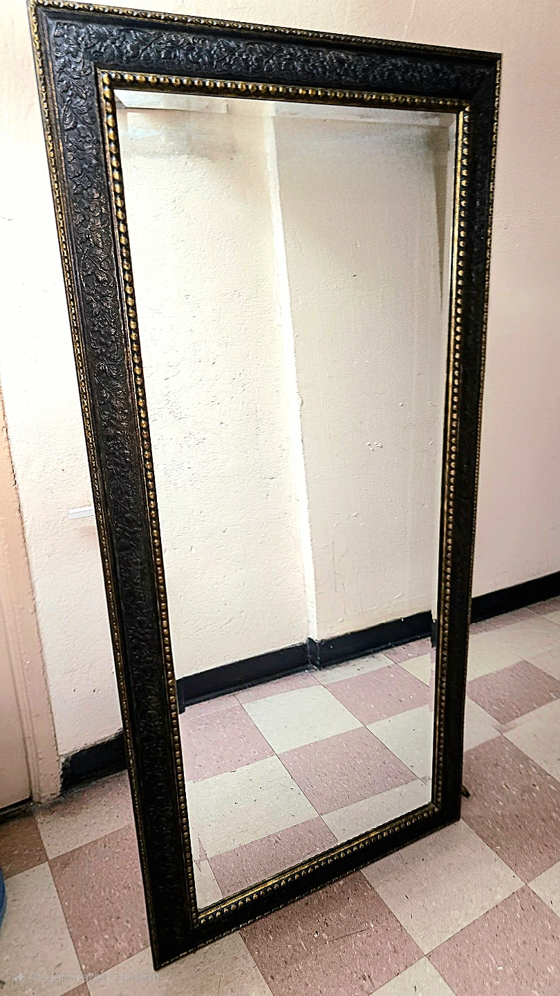 Large floor mirror. Black frame with gold detailing. Intricate carvings. Perfect for a bedroom or entryway.