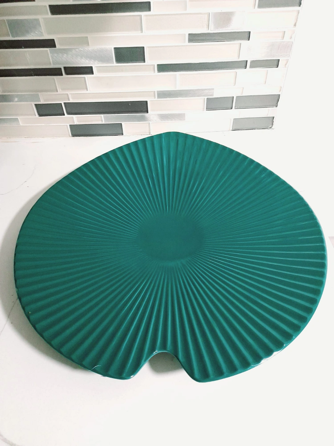 129Unique, decorative serving platter. Teal green color. Scalloped edges. Perfect for parties or everyday use.