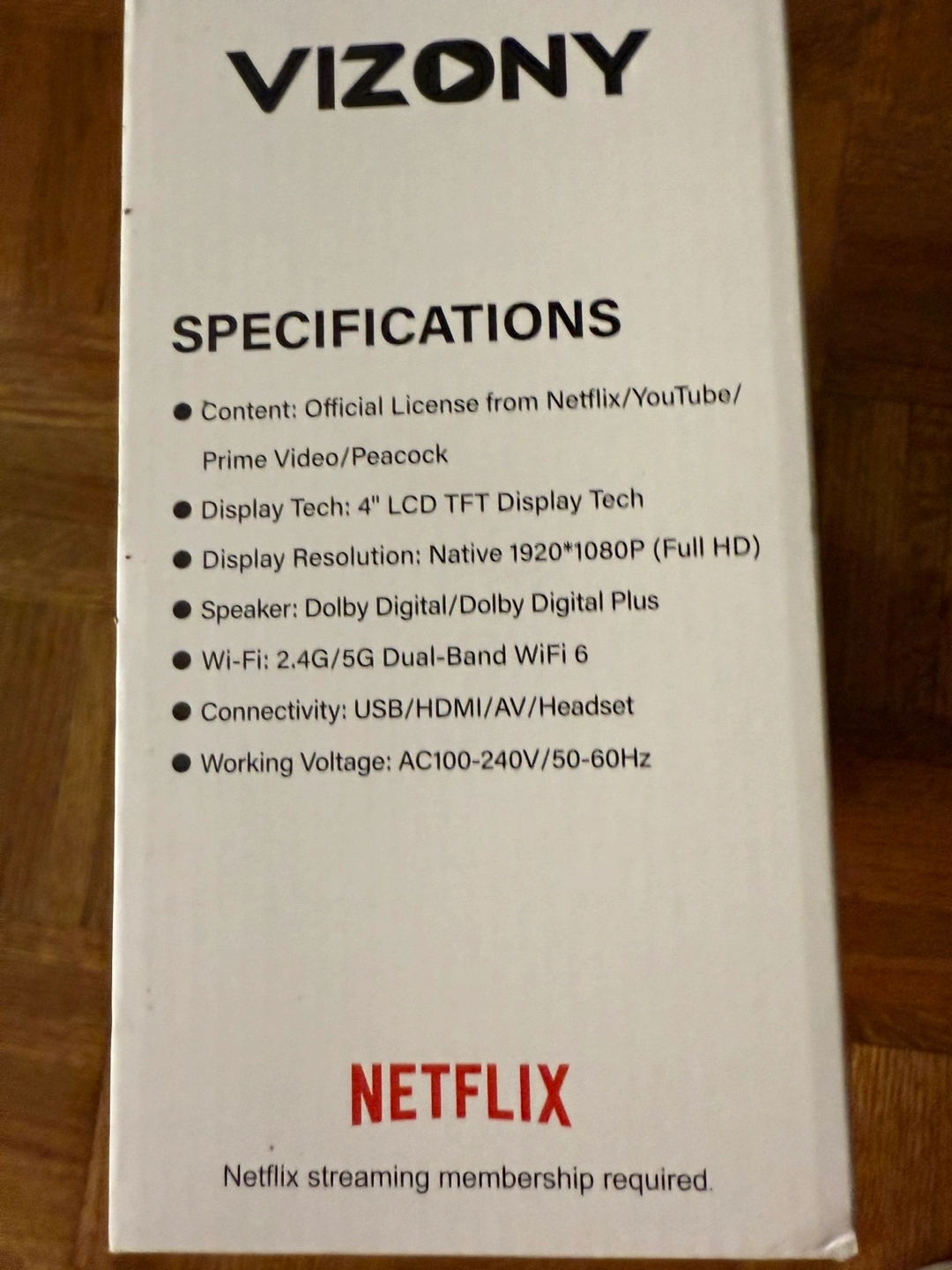 New in box. 4" LCD TFT display. Full HD 1920*1080P resolution. Dolby Digital/Dolby Digital Plus. Wi-Fi and Bluetooth. USB, HDMI, AV, and headphone connectivity. Netflix, YouTube, and Prime Video compatible. Netflix streaming membership required.