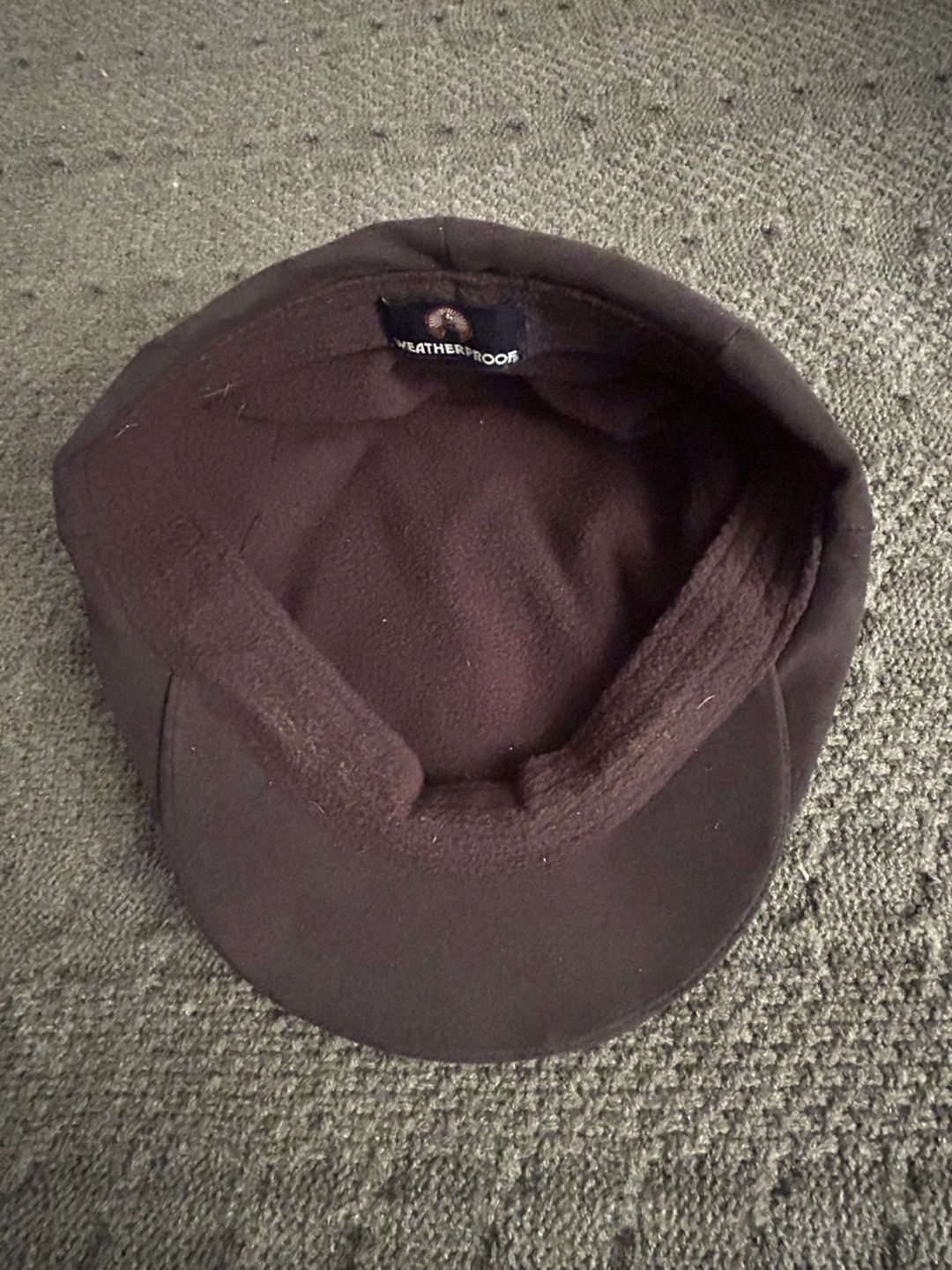 15Weatherproof Hat, a.k.a. Flat Cap, Driving Cap, Cabbie, Golf, Newsboy, Great Gatsby Style Soft, Ultra Suede Feel (outside), Fleece lining (inside for added warmth) Snap button in front lid Black Size Large Please be able to meet in Forest Hills, Queens and take a look at my other postings too!