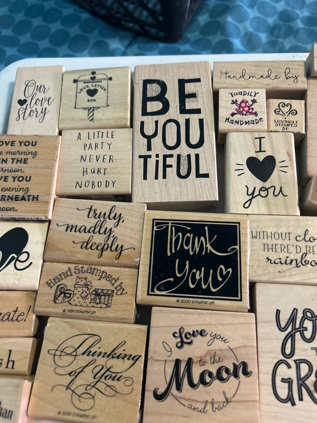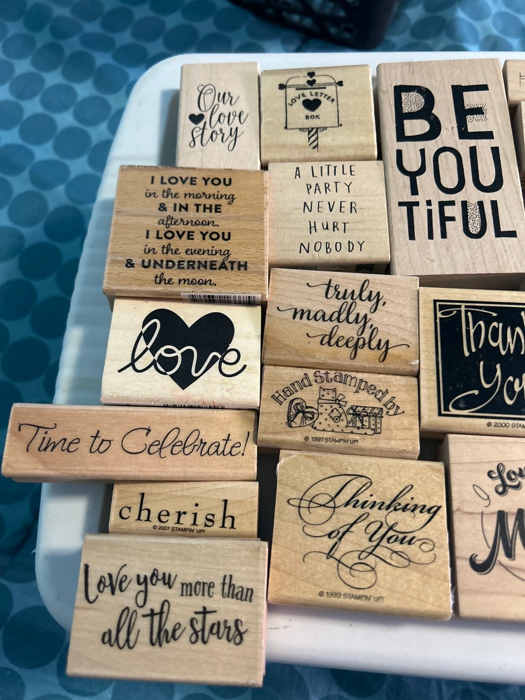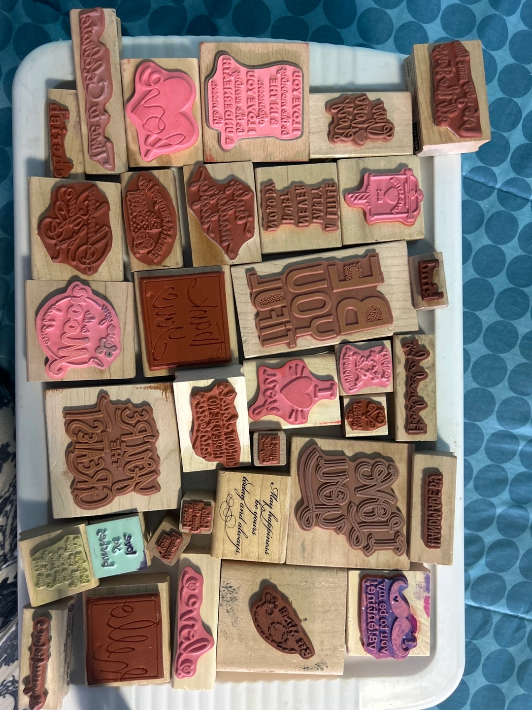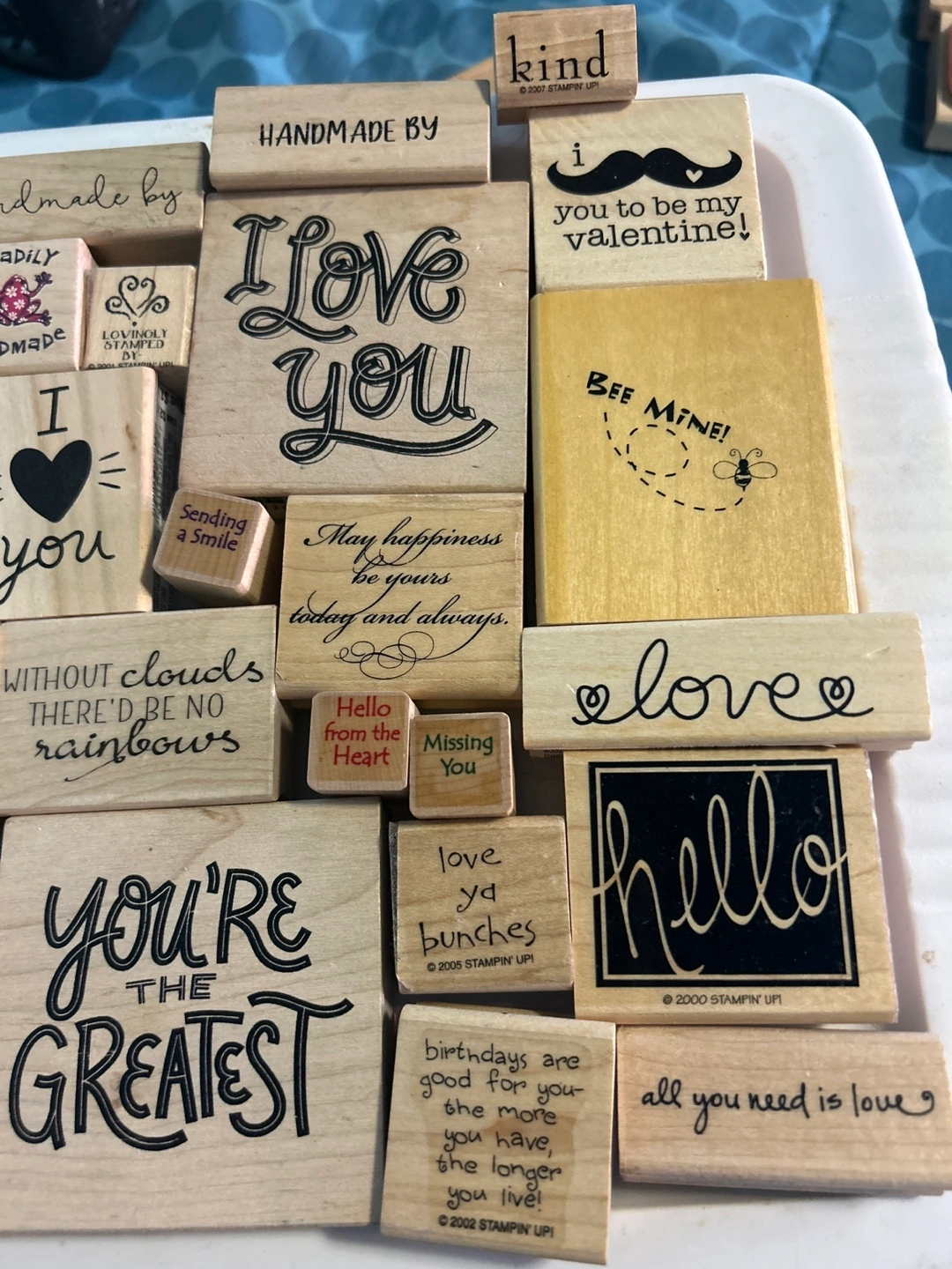 Large collection of wooden-mounted rubber stamps. Various romantic and friendship sayings. Many different styles and sizes. Perfect for card making and scrapbooking. Most are from Stampin' Up!