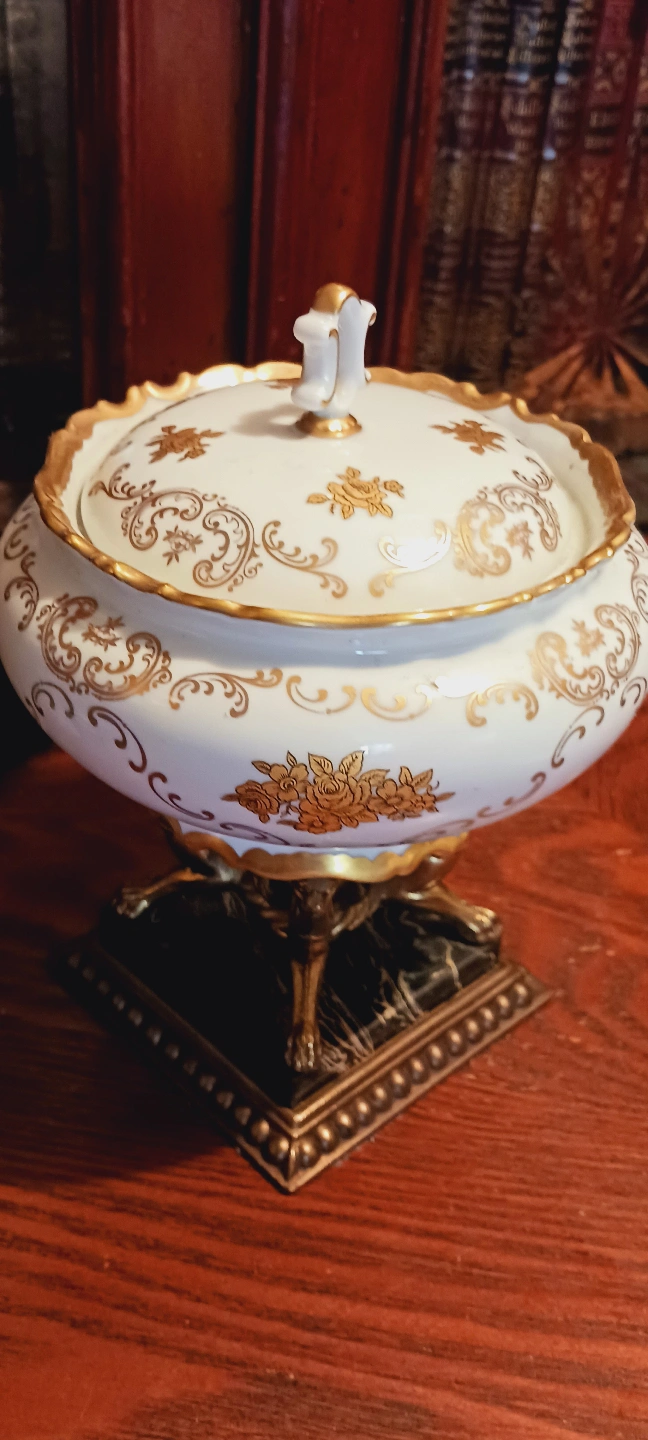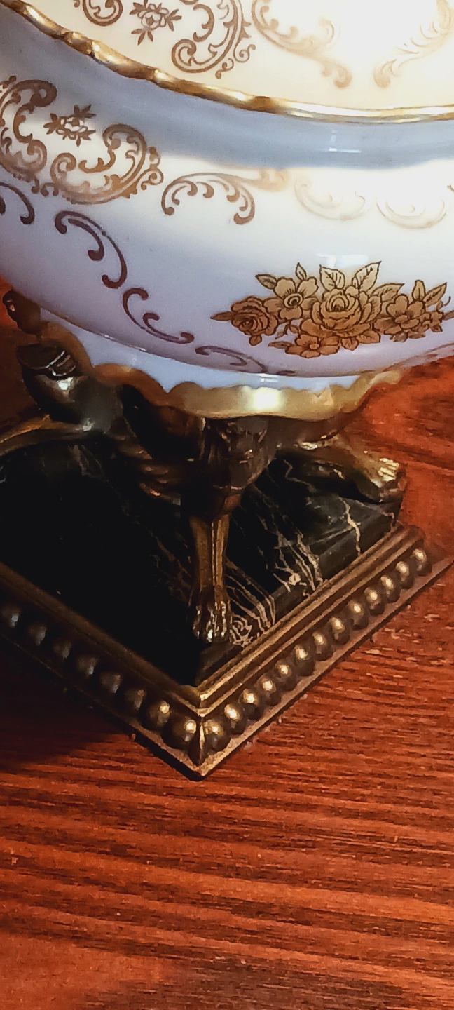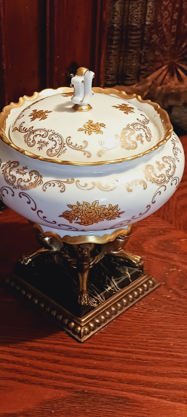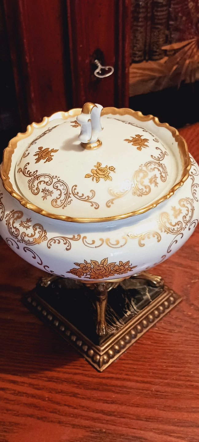 Absolutely Gorgeous Reichenbach Fine German 22K Gold Handpainted Porcelain Beautiful Lidded Candy Dish with Brass and Marble Pedestal Base. Elegant porcelain candy dish. Features gold detailing and ornate design. Rests on a decorative stand. Perfect for candy, trinkets, or display. 9"Γ6". Made in Germany π©πͺ. Excellent Mint condition. ALL MY PRICES ARE NEGOTIABLE !!!! BEST OFFER !!!