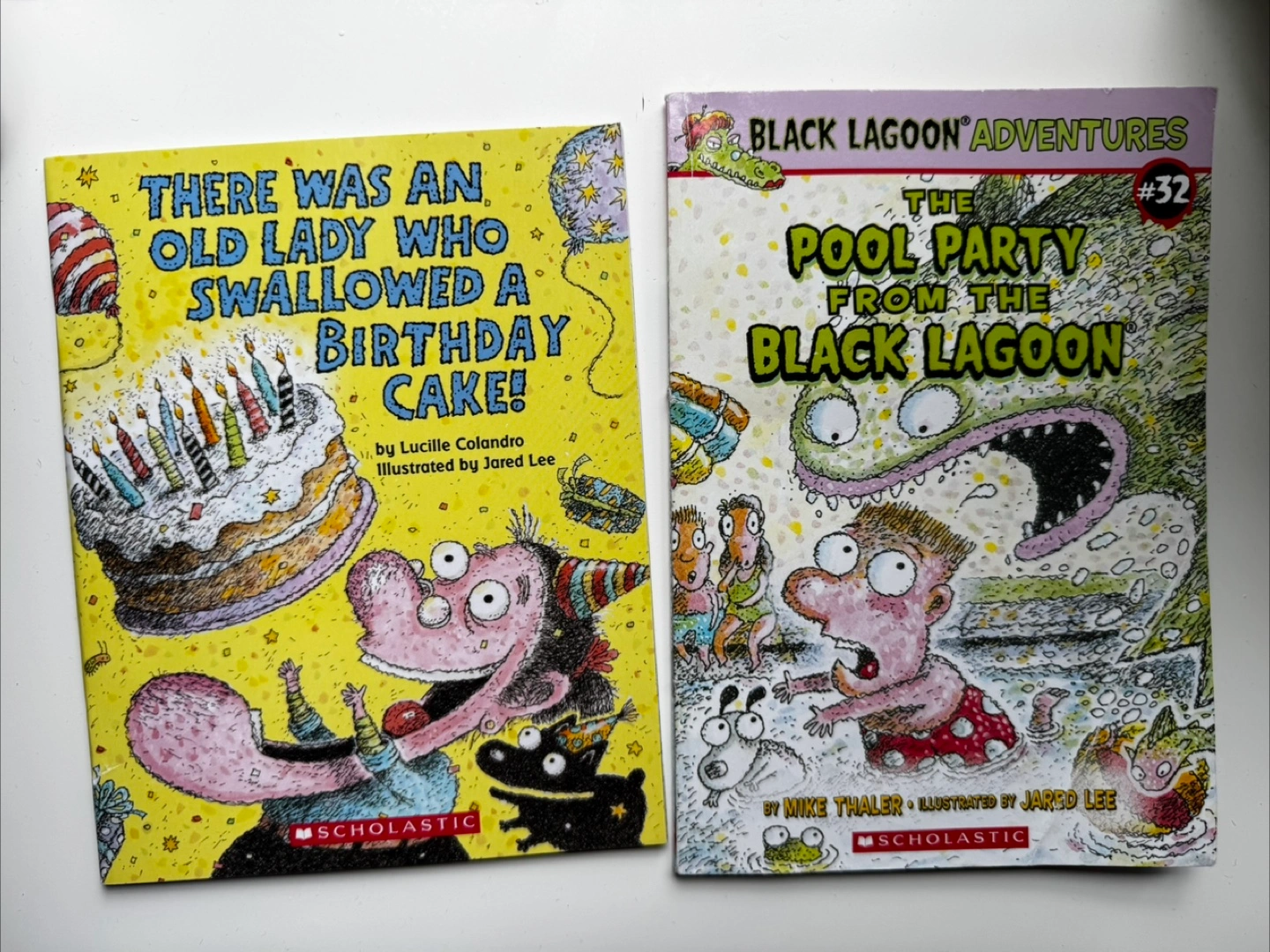 Two Scholastic books for sale. One is "There Was An Old Lady Who Swallowed A Birthday Cake" by Lucille Colandro, illustrated by Jared Lee. The other is "The Pool Party From The Black Lagoon" #32 in the Black Lagoon Adventures series by Mike Thaler, illustrated by Jared Lee. Grade 2 reading level.
